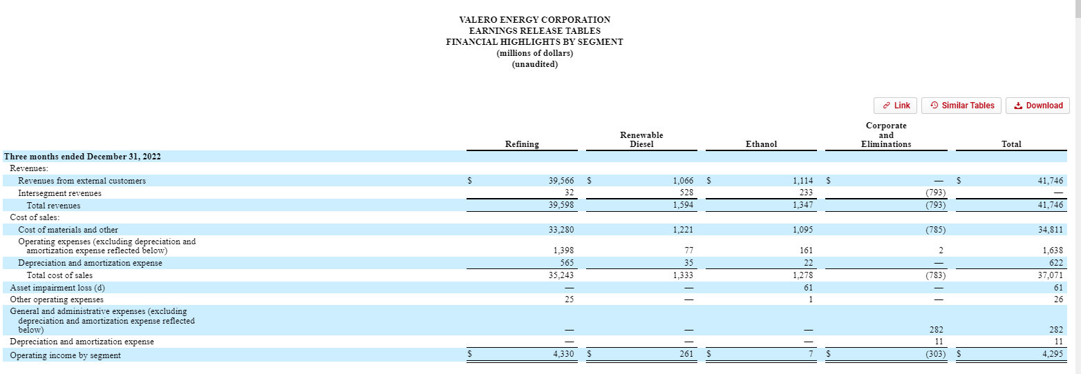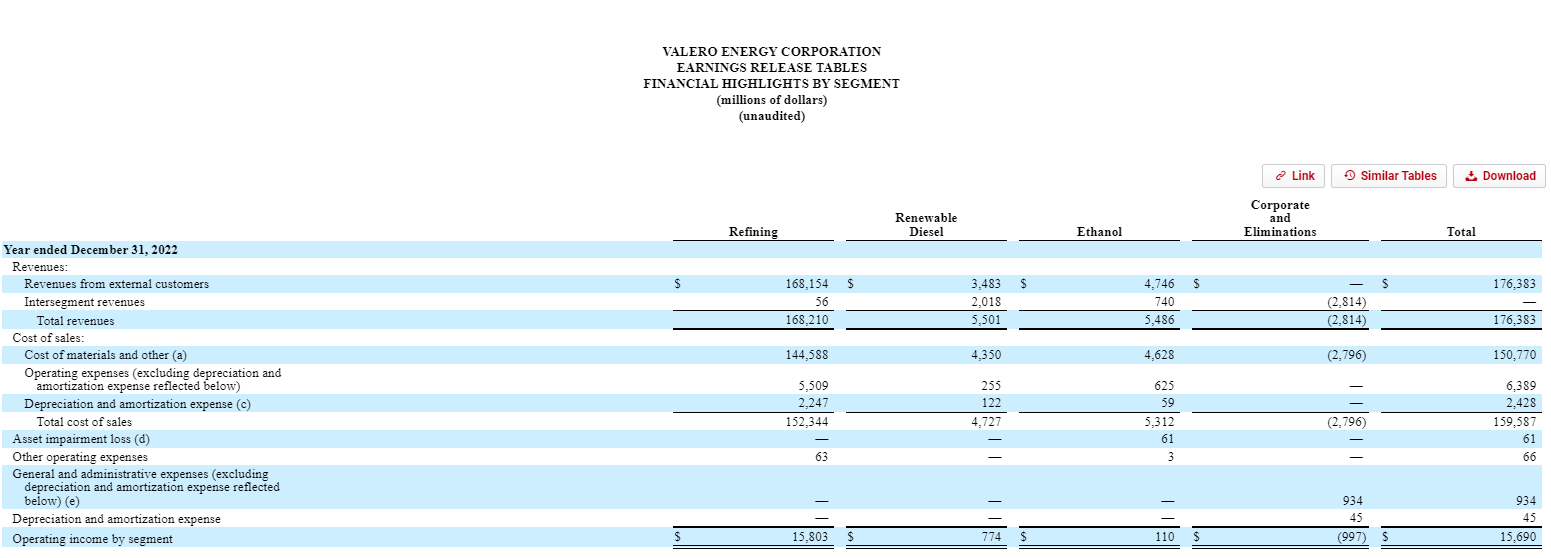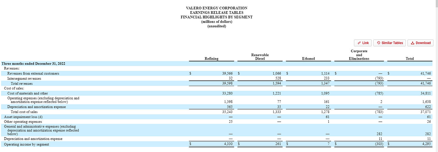 And yes, these are record crack spreads. But they sustained for all of 2022! VLO earned just shy of $16B in refining operating income in 2022.