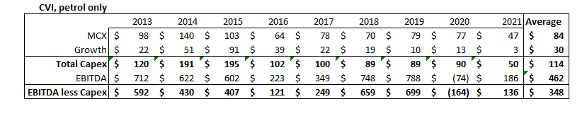 Calm down there officer! This section is already running wildly long, so I’m not going to go crazy defending myself in value court. I’ll just note that refiners generate plenty of cash flow over a cycle. Below I’ve got CVI’s petrol only EBITDA, MCX, and total capex from 2013-2021.