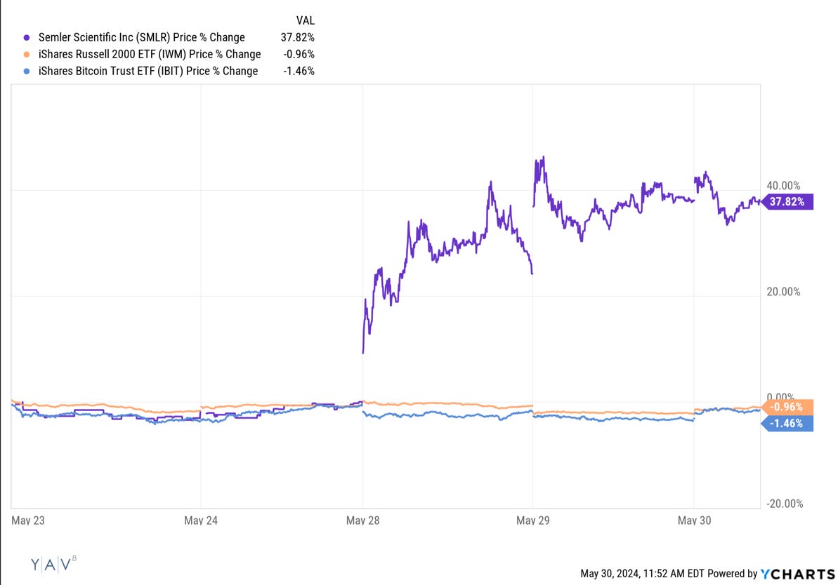 This week, Semler Scientific (SMLR) announced a new Bitcoin Treasury strategy. The market responded…. very favorably to the news, with SMLR way outperforming the market and Bitcoin: