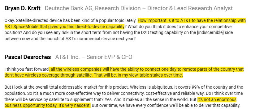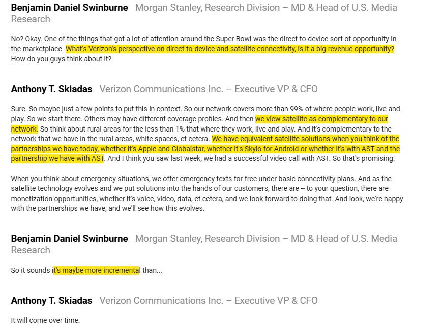 This article is by no means intended to be a full write up of ASTS. Again, I’m skeptical but have no position either way, so I don’t need to have strong views or do a full write up! I really only wanted to highlight the divergence between T / VZ’s actions and words here and how interesting I think that is!