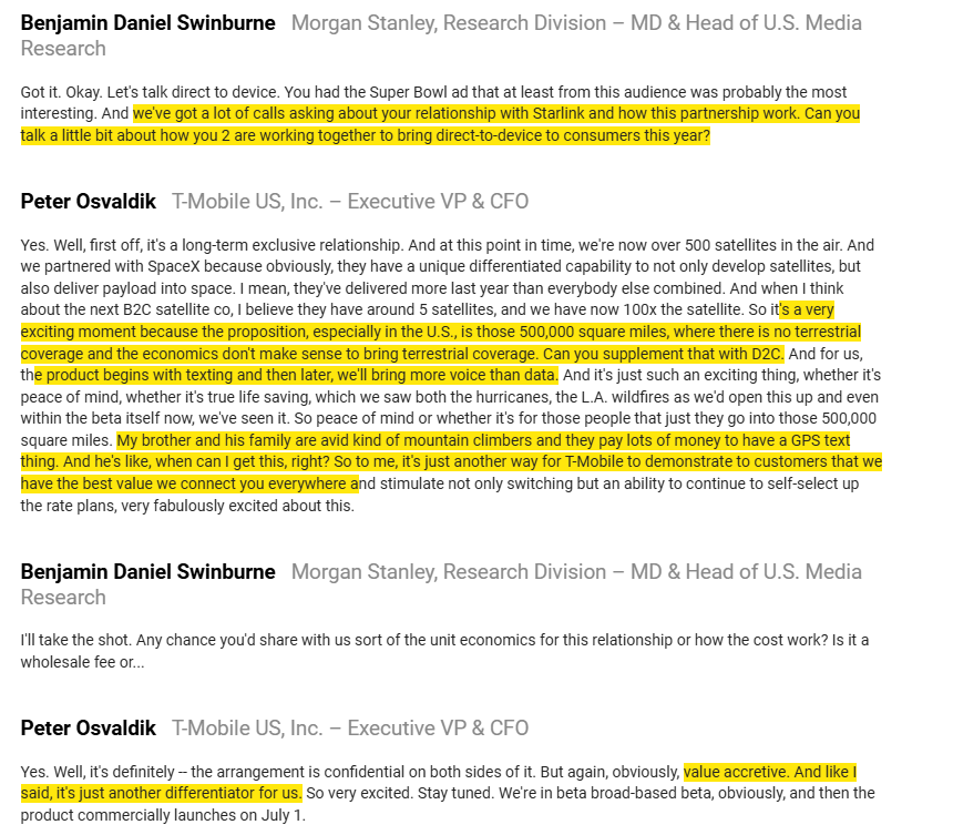 With all that in mind, the quote below from T-Mobile (who is partnering with SpaceX) is really interesting because it splits the line so finely between “this is just really good for marketing” (i.e. you get it just for the piece of mind) and “this is actually a value add” (i.e. it covers those 500k square meters of deadzone for rock climbers and during disasters):