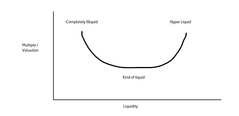 In that chart, you can see stocks that are extremely liquid enjoy a premium multiple, while assets that are extremely illiquid (or, preferably, don’t trade at all, so effectively no liquidity) enjoy a premium because they can be “volatility laundered” / are so in demand from allocators. It’s assets in the middle that seem to suffer. These are assets that are liquid / publicly traded, but not so liquid that pod shops can trade in and out of them like water. Think smaller companies that are out of the indices, semi-controlled companies that only trade a few thousand shares a day, companies trading on smaller exchanges, companies with some restrictions on ownership (like MLPs mentioned above), etc. Across the board, those assets seem to trade for lower multiples and would probably get a boost if hey went fully illiquid (i.e. private) or liquid (i.e. took steps to improve their liquidity to get a multiple boost).