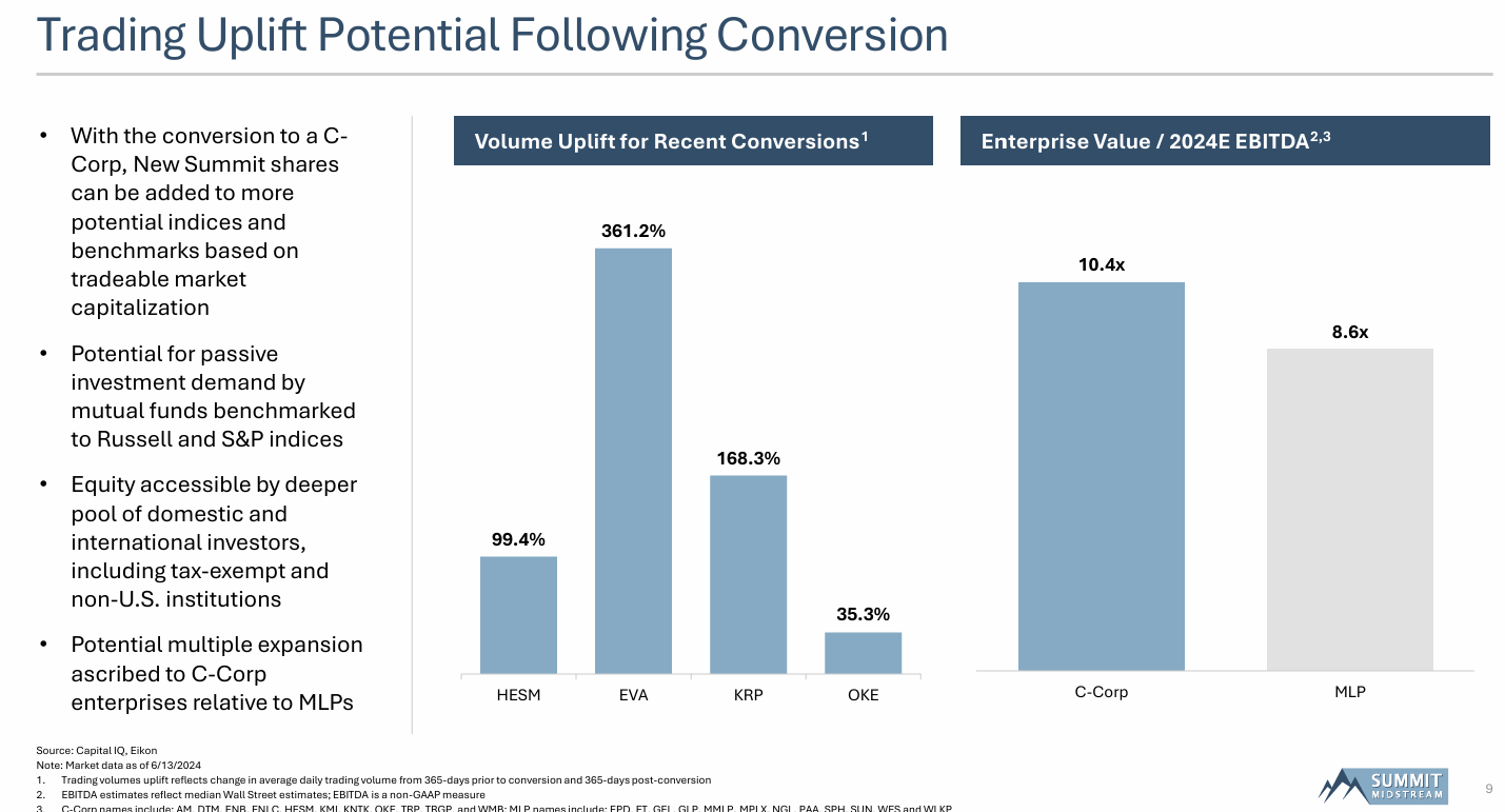 Stocks that go from mlp to c-corp: Stocks that trade in MLP form have a limited buyer pool for a variety of reasons (I believe the reasons are largely tax related, but I am not a tax advisor and this isn’t tax advice!). Because of that limited buyer pool, a variety of MLPs have been pursuing C-Corp conversions, and the result has been a much more liquid stock that tends to trade for a better multiple… what’s particularly interesting about that is, all else equal, a company in an MLP wrapper should trade for a higher multiple than a C-Corp. Why? Again, not tax advice, but MLPs don’t need to pay taxes at the corporate level (they pass taxes on to their shareholders) while C-Corps do need to pay taxes at the corporate level. Thus, the C-Corp has the dreaded “double taxation” where they pay taxes on their profits and shareholders will need to pay taxes on dividend / capital gains they receive while the MLP avoids that double taxation. All else equal, MLPs should thus trade for a higher multiple since their cash flows are less burdened by taxes…. but it appears the market favors the simplicity and liquidity that comes with a C-Corp. Interestingly, we’re seeing MLPs respond by converting to C-Corps to try to get more liquidity / a higher multiple; in fact, there are only a handful of publicly traded MLPs that remain outstanding because most of them have converted to a C-corp to get a higher multiple or gotten taken private by a sponsor looking to capture that multiple arbitrage for themselves…. ok, the later is my opinion, not fact, but the former is definitely real; the slide below is similar to a slide most MLPs will publish when they announce a C-corp conversion: