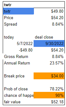 TWTR- In case you’ve been living under a rock, Elon Musk is buying TWTR for $54.20/share. As I write this, the stock is trading under $50/share. That’s an almost 9% gross spread and way higher annualized. Why’s it trade so wide? Well, bears would say “Musk might wake up on the wrong side of the bed and decide to walk away from the deal, and the U.S. regulatory regime isn’t exactly going to smile on the richest man in the world buying the most important social media platform in the world (from the perspective of moving markets / the political discourse).” Bears would also suggest that the Elon / TWTR merger contract is pretty loose; I’ve heard them toss around “it’s a PE style contract, and he can walk away from the deal with just a $1B break fee.” Ok, that’s all fine…. but if you assume the downside to TWTR is in the low to mid $30 (around where it was before the deal announced), then the stock is currently pricing in less than an 80% chance of the deal going through. That seems pretty low to me; I’m not aware of any other “PE style contract” that trade close to that wide. And nothing about how Elon is approaching the TWTR deal makes it seem like he struck the TWTR deal on a whim or is just going to walk away for no reason; from selling billions of TSLA stock to raising $7B from some of his friends, Musk is taking non-revocable actions that suggest he has every intention of going through with the deal (remember, he’ll owe hundreds of millions in taxes on those TSLA sales, so he’s already incurred a bill thanks to that!). And, yes, the regulatory environment today isn’t exactly conducive to rich people buying important companies…. but we still live under the rule of law, and regulators trying to block this deal simply because Elon is rich would be a very novel approach to regulation that would almost certainly be destroyed in court.