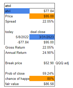 ATVI- This has been a popular topic of conversation for the past week since Buffett revealed he bought almost 10% of the company for the arbitrage. ATVI is getting acquired by MSFT for $95/share; investors are worried regulators will block the deal so it trades for a massive spread. ATVI was trading in the mid-$60s before the MSFT deal news broke, but the QQQ has been a disaster since the deal announcement so I’d guess downside in a break is in the low $50s (they’d also get ~$2.50/share in cash from MSFT if the deal fails to close, which is pretty significant at those break prices!). At current prices, that means ATVI is trading at ~60% chances of closing. That seems too low to me; the video game market is enormous, and I think the DOJ would have a very tough time proving MSFT buying ATVI is going to stifle competition or creativity in the industry. I’d guess MSFT would be a 2:1 favorite to win in court if we got there, so at current prices investors are baking in 100% chance the DOJ sues to block and pricing ATVI with worse odds of winning then I think they actually have. It feels a little reminiscent of the T / TWX deal to me; investors all along were worried the DOJ would sue to block but thought the DOJ would lose in court if they did, and that all ended up proving correct (the DOJ sued and then got wiped in court).