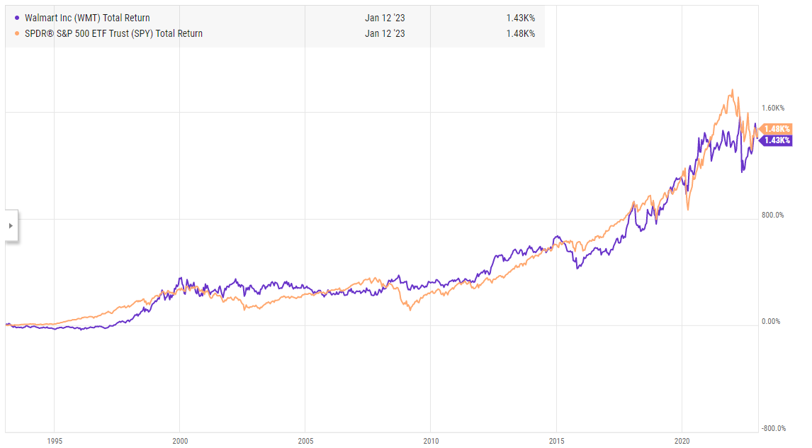 As the Japanese asset bubble busts, by the early 90s one family shoots to the top of the list: the Walton family, heirs to the Walmart (WMT) fortune. If you invest alongside them, you actually do alright. You’d outperform the index pretty nicely for the first few years of your holdings. That performance eventually levels out, but here we are ~30 years later and investing alongside of the Walton’s would have lead to ~index like performance. Not bad for what was already a huge company!