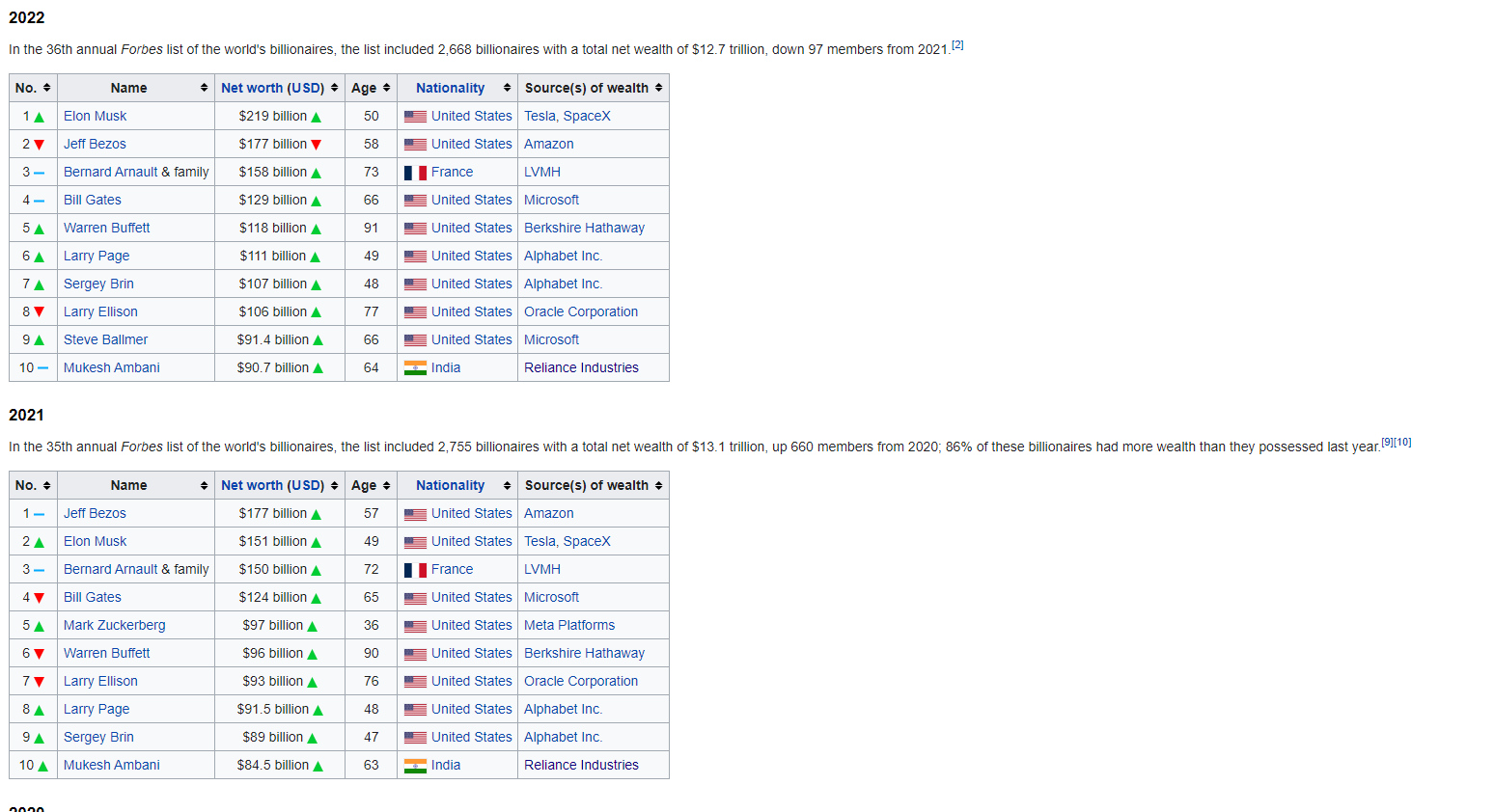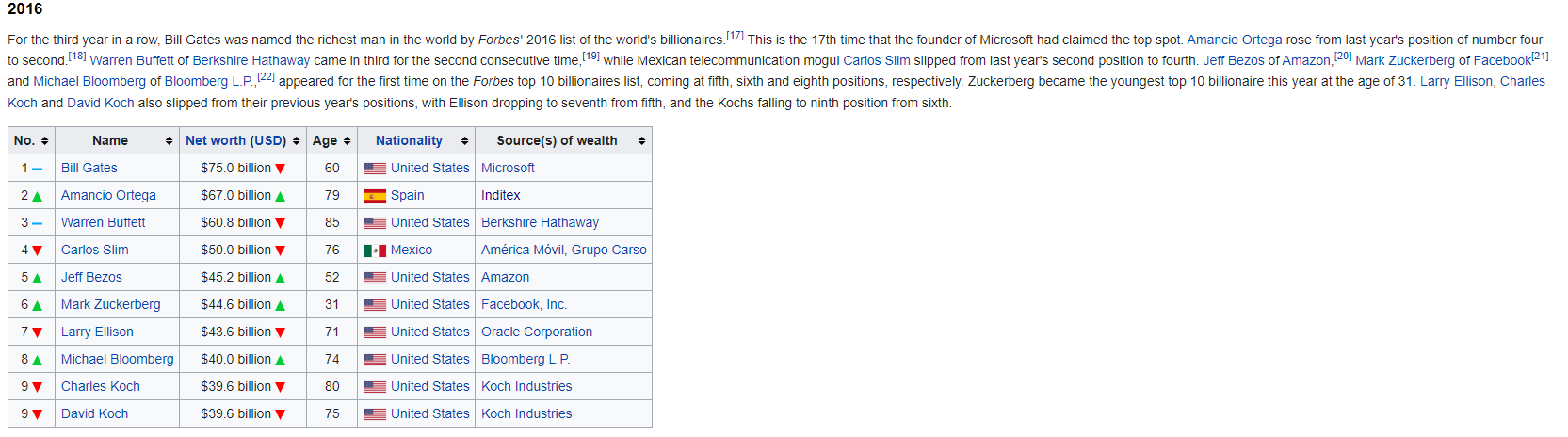 The mid-2010s sees the rise of the tech kings. Gates is back to the top of the list, and Bezos and Zuckerberg start appearing on the list in 2016.