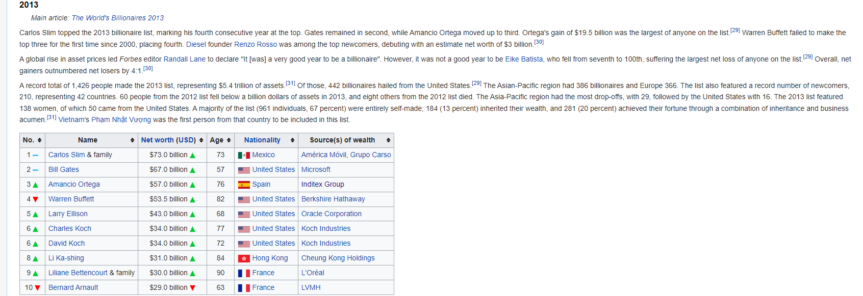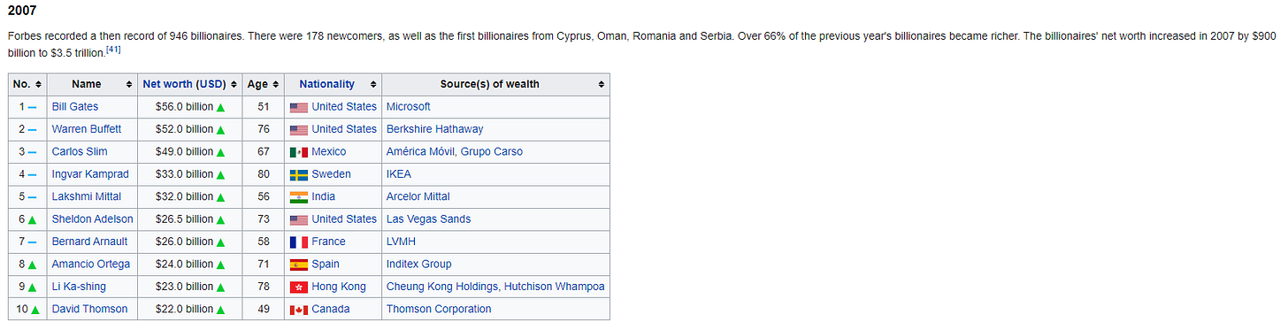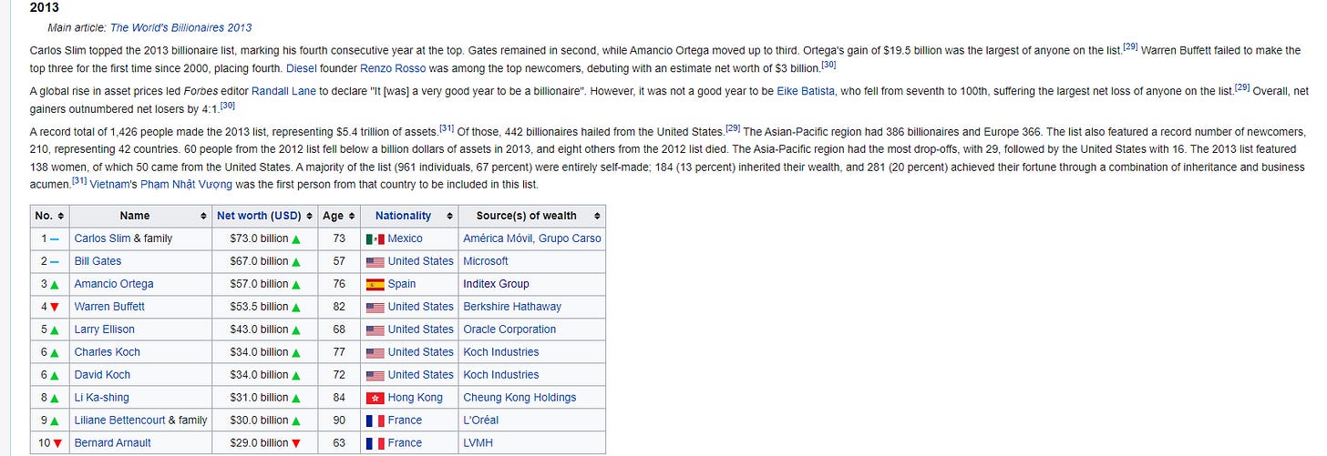I think this would be particularly difficult if you’re an “invest with the world’s richest people” investor; by 2013, Slim now has ~two decades of being at or around the top of the richest people list, and he tops the list for four years straight! He’d be making an absolutely compelling case to get your incremental “invest with the richest people” dollars, and that case would ultimately prove to be a disaster for you…. though, again to be fair, #2-4 on the list are Gates, Buffett, and Arnault (LVMH); if you picked them instead, you do really well!