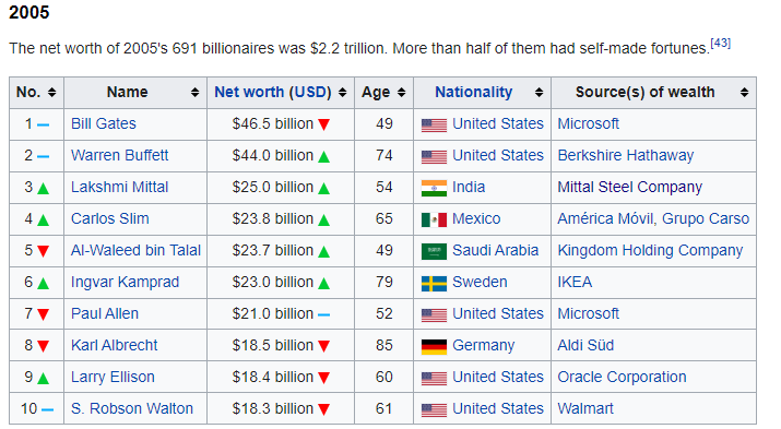 Gates, Buffett, and the Walton family generally dominate the lists in the early 2000s. It’s not till the mid 2000s when we start getting some new names…. well, actually, we start getting some old names back again. Carlos Slim, who had one appearance on the list in the early 90s (#10 in 1994!), comes back onto the list in 2005. Larry Ellison also returns to the list in 2005, and we get a newcomer on the list: Lakshmi Mittal, head of the Mittal Steel company.