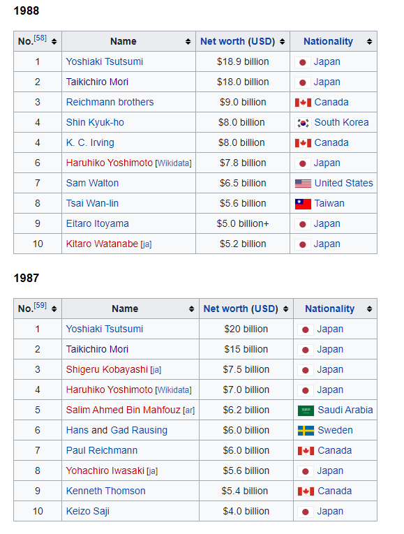 The rankings start in the late 1980s, and they’re dominated by one country: Japan. The late 80s is right in the mist of the Japanese asset bubble, and the Forbes list absolutely reflects that. Check out what the first two Forbes lists look like!