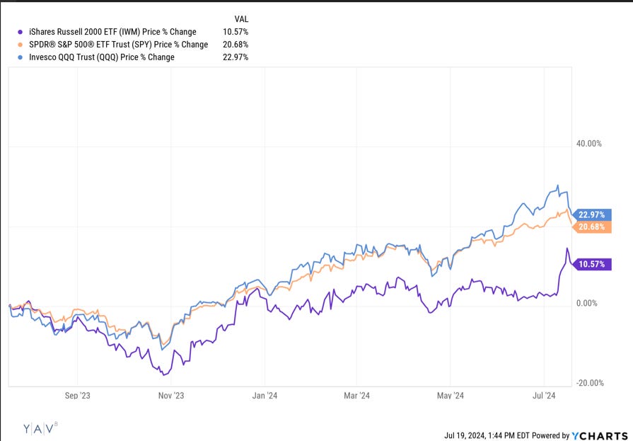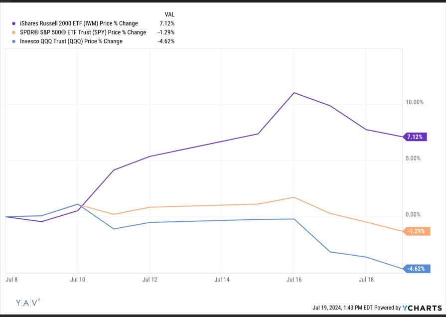 It has been a wild few weeks in financial markets. Over the past two weeks, small caps (which I’ll broadly define as the Russell 2000) have been absolutely ripping, while large caps and tech have actually trended down a bit.