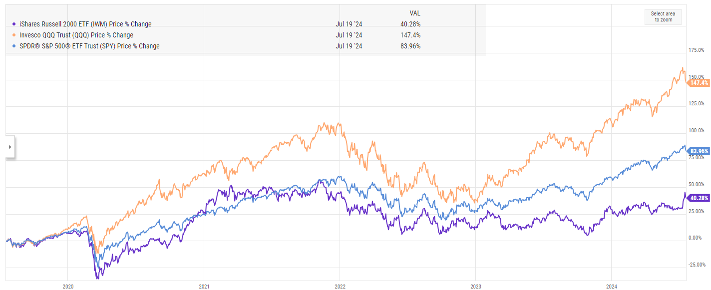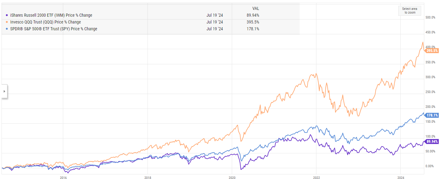 And that’s not just a one year trend: large caps and tech have been beating the pants off small caps for the past ~decade.