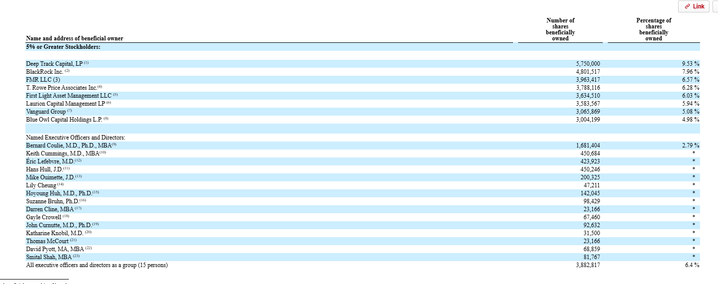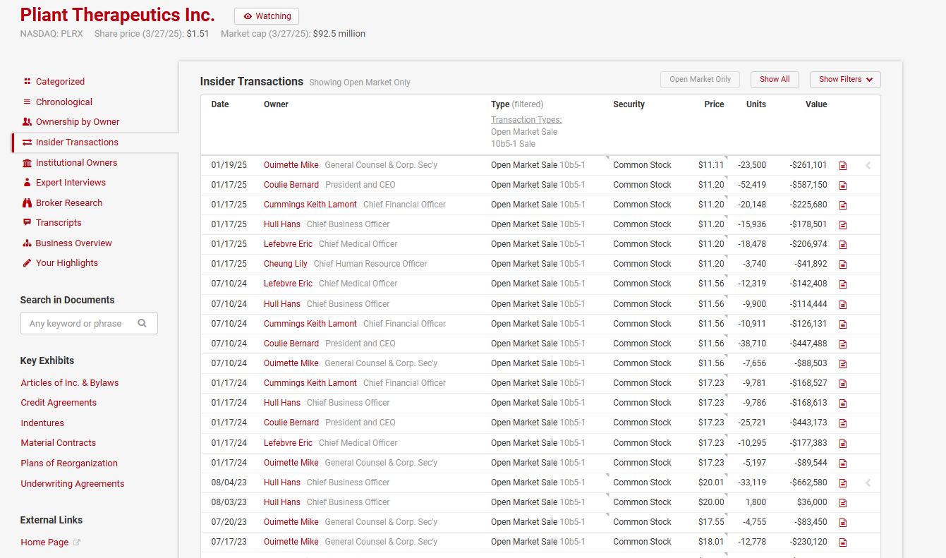 Pliant Therapeutics (PLRX; disclosure: I have a small position) had to pause trials on their lead drug on the recommendation of a safety board…. but not before the company basically said “we don’t believe the panel that the drug has an issue” and then spent more money on a commission to investigate the drug and realizing there was indeed a safety issue. The company has >$350m in cash and a market cap of <$100m. Insiders have been consistent sellers of the stock and insider ownership is basically nothing (almost all the insider ownership you see in the screenshot below is from far out of the money stock options). Rather than return cash to shareholders, the company seems interested in spending the cash pursuing some very early stage drugs in their pipeline…. does that decision have anything to do with the miniscule levels of insider ownership, the ~$250k in annual board fees each board member gets, or the >$25m/year in combined comp for the top executives (a number so egregious shareholders voted against it at the least annual meeting)? Seems at least plausible to me!