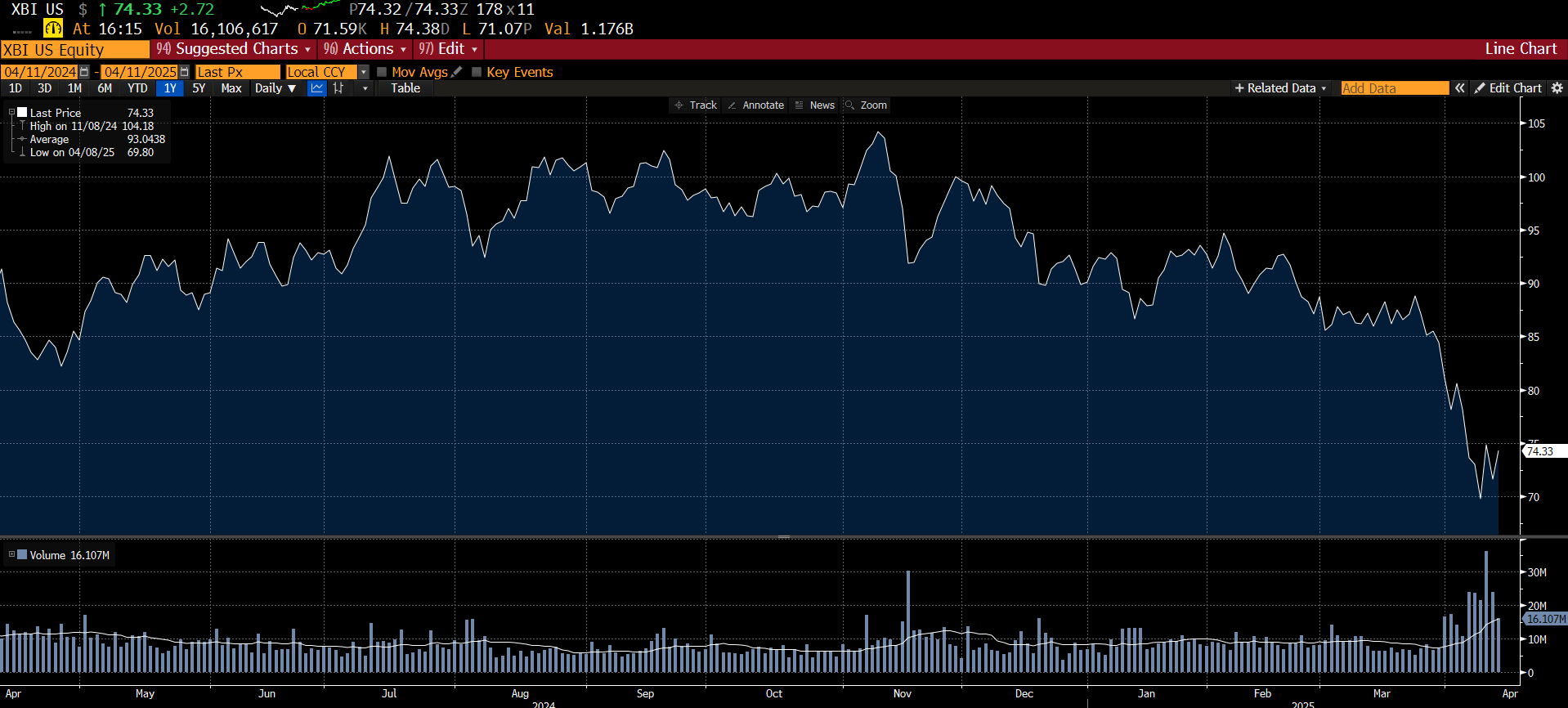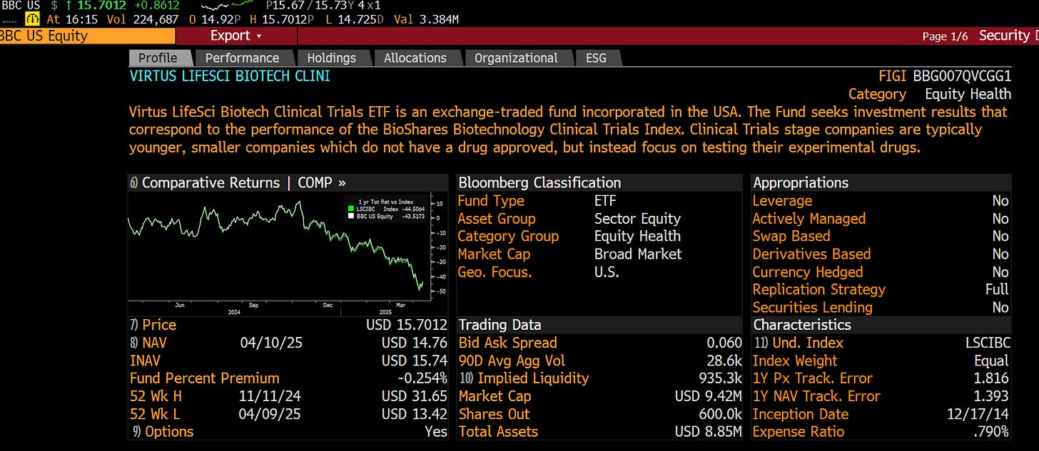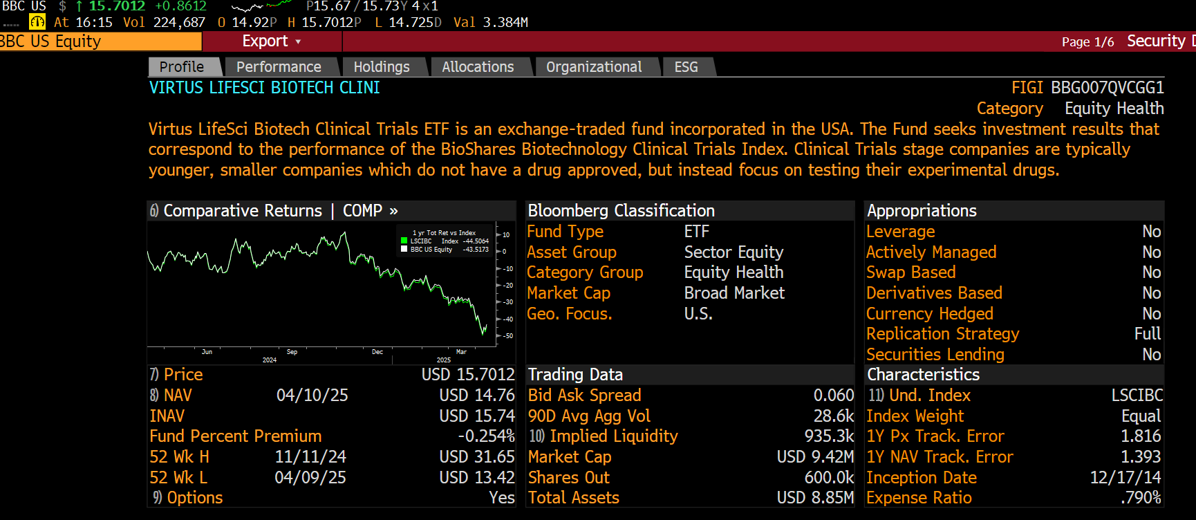 The first is the BBC ETF. This is a very small ETF (its market cap is ~$10m!) that tracks the preclincal companies. That ETF is down >40% over the past year and ~50% over the past six months!