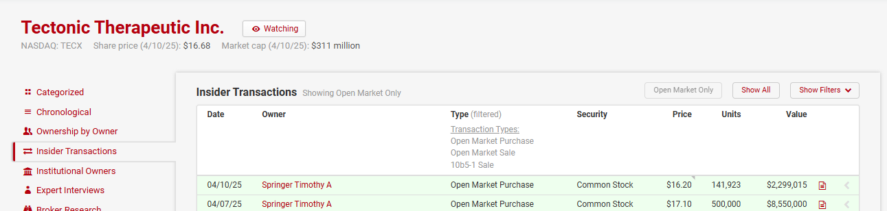 Similar to TARA, TECX had a who’s who of sophisticated funds PIPE in $185m at ~$50/share (about in line with the stock’s prior closing price; though the stock was volatile so it may have been a slight premium or discount depending on when they priced it); the stock has been smoked in the recent carnage1 and is currently trading for roughly cash value, and there’s a director / 10% owner who’s bought ~4% of the company in the past few days: