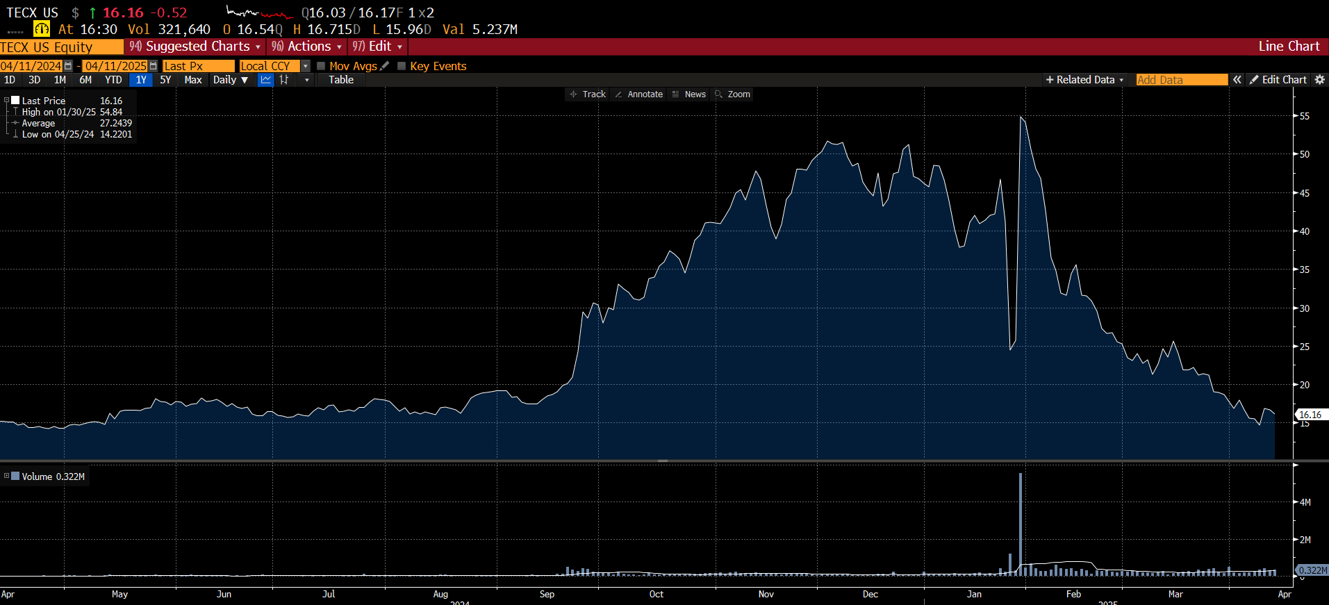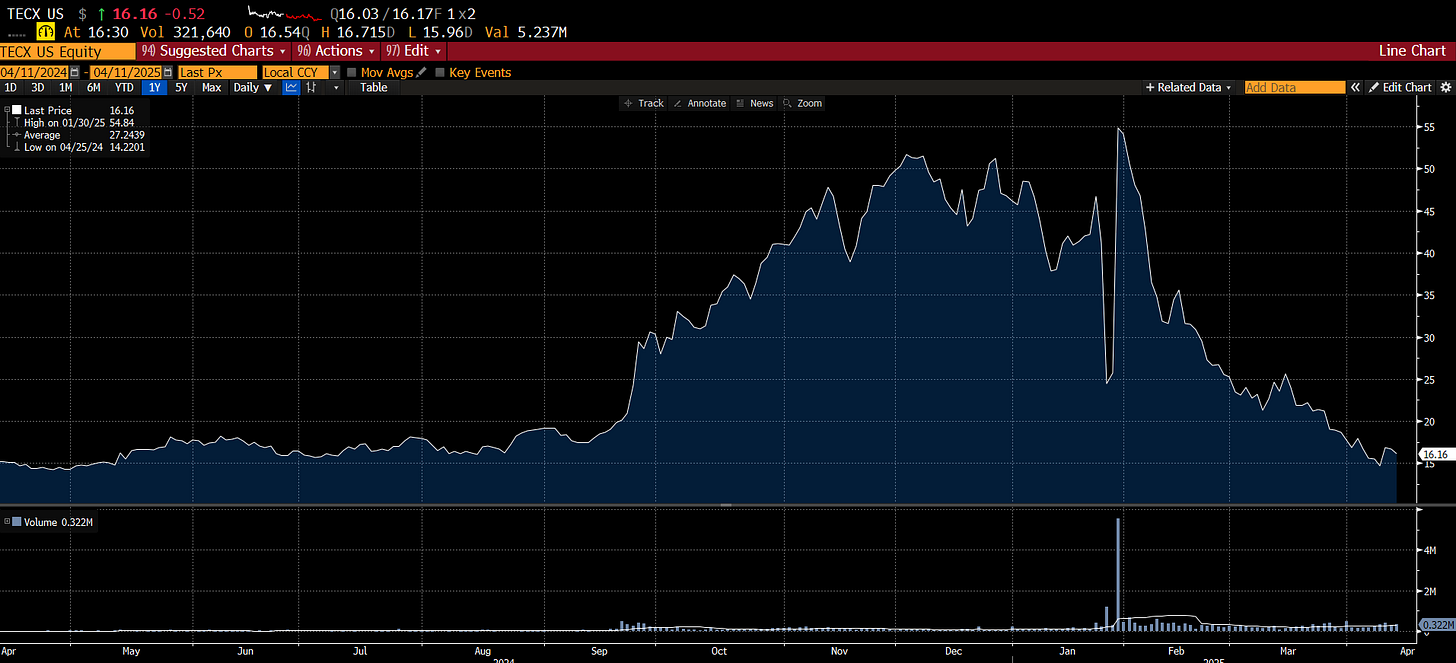While I believe a lot of the sell-off is market related, I think a competitor discontinued a drug with a similar profile to TECX, so there could be some science related reasons for the sell-off too. I’m not close enough to the company / science to strongly opine!