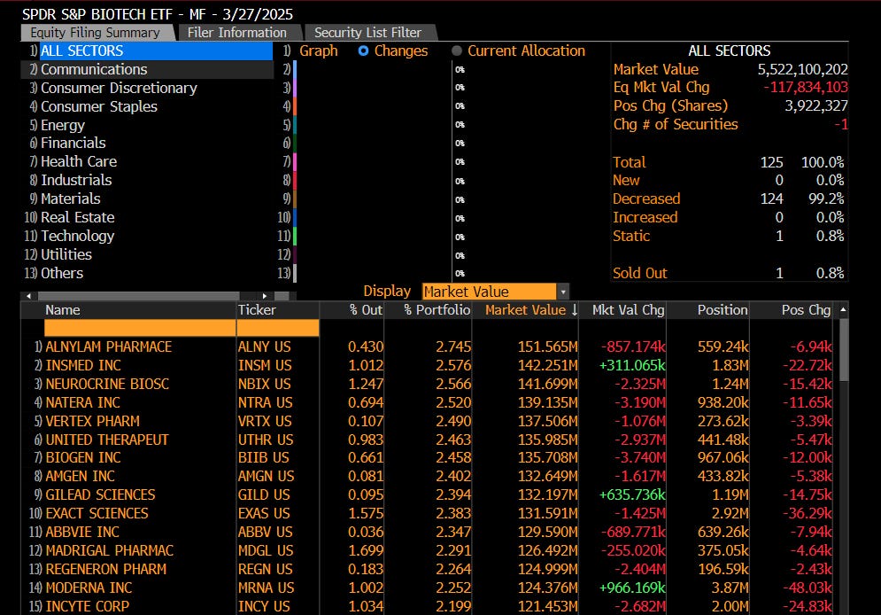But here’s the thing: in summer 2024, the S&P changed the weightings for the Biotech index that the XBI tracks. The new weightings pushed the index much more to larger cap companies that were post commercialization (previously, the index was something like 100 companies all with a ~1% weighting and rebalanced pretty frequently; now it’s the 25 largest bios with >2% weightings making up the vast majority of the index). You can see the results in their current holdings: