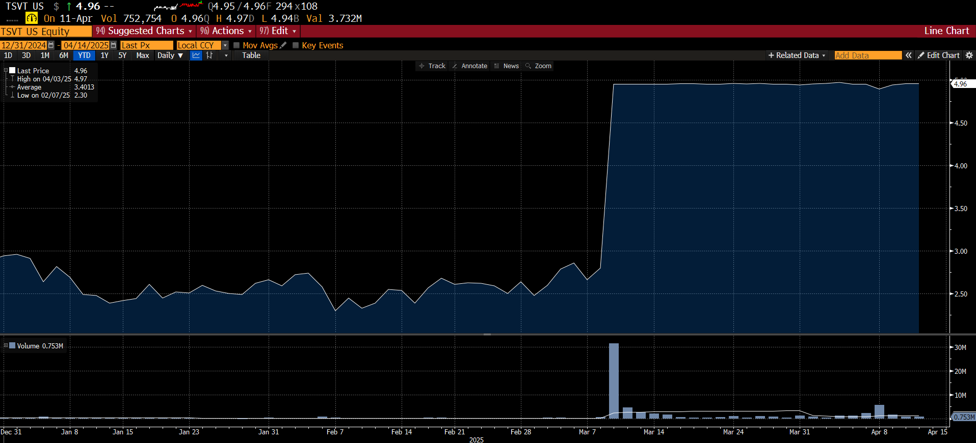 Let me end this note / series by giving you one recent deal, because I think it’s such proof of concept for so many of the things I’ve discussed in this series. 2Seventy Bio (TSVT) has a long and very checkered past, but heading into this year it consisted of basically two assets: ~$3.50/share in cash, and a 50% stake in Abecma’s domestic stales (a late stage cancer drug they’re partnered with Bristol Myers Squibb on). Clearly, TSVT had value over and above its cash (Abecma did $242m in domestic sales in 2024), but, despite that clear value, TSVT did not trade for >$3/share this entire year…. until they announced a deal to be acquired by BMS for $5/share (a ~90% premium) in mid-March.