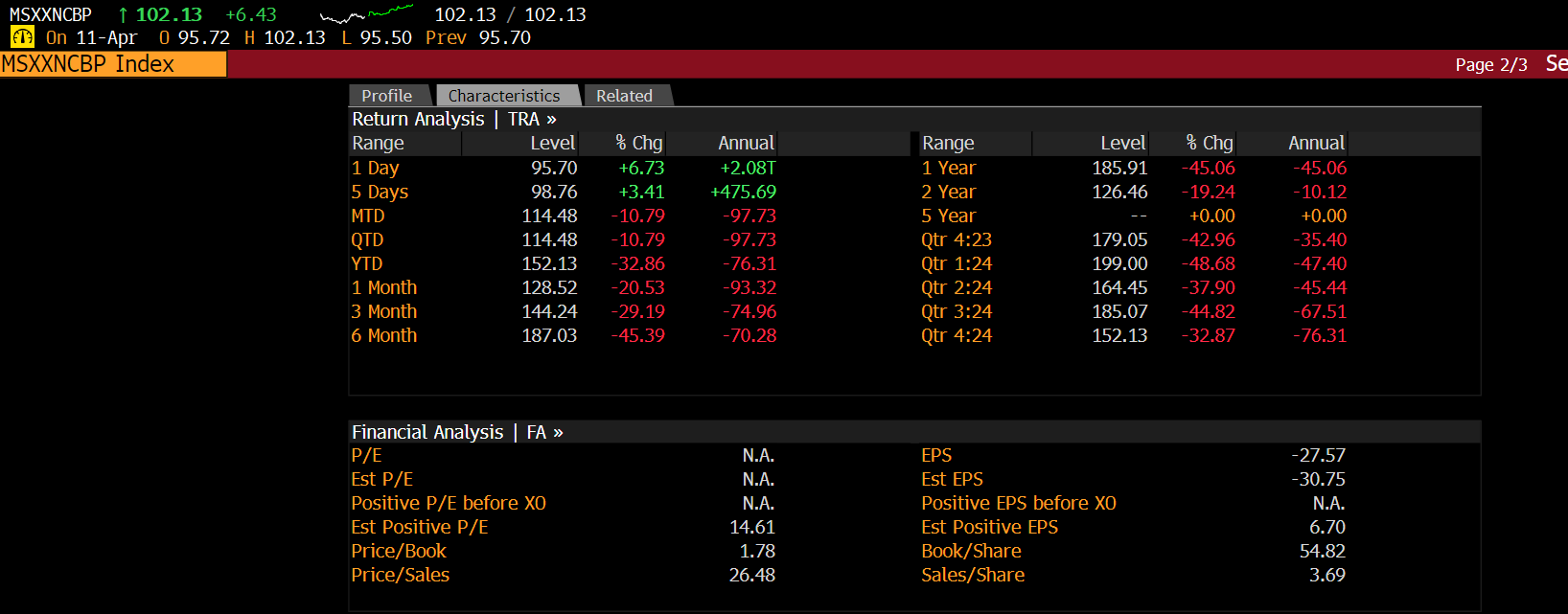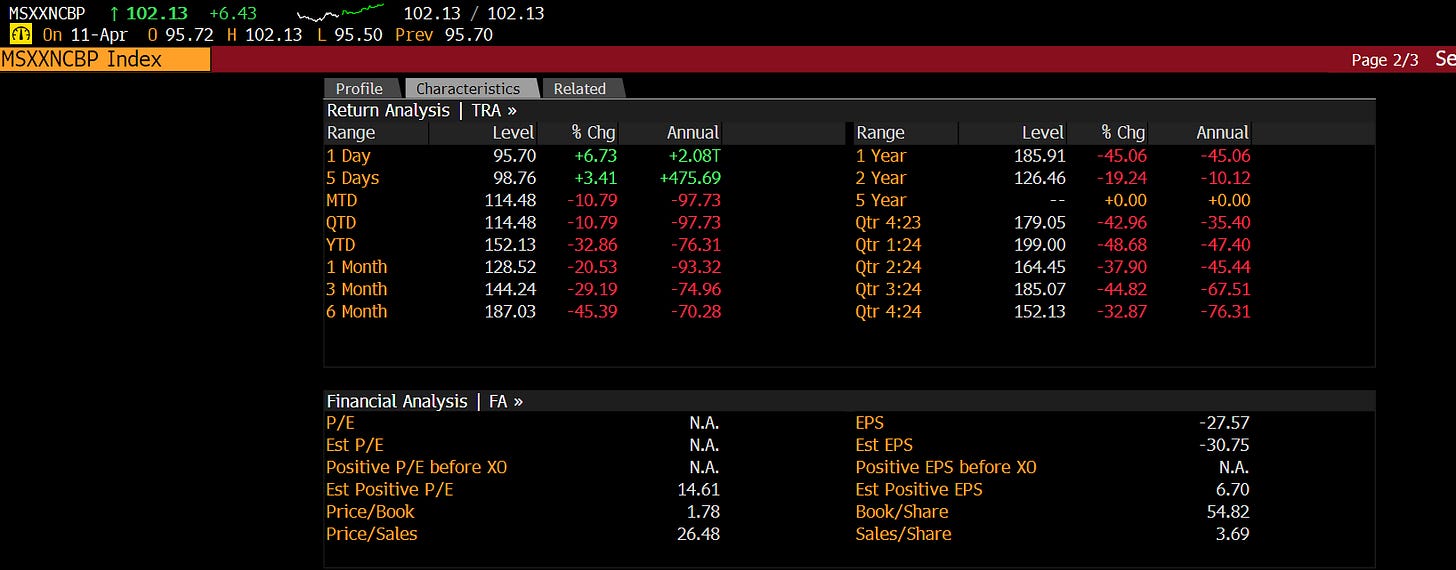 The other way I can show the pain in earlier stuff is even funkier. Someone on Twitter shared with me the custom index MSXNNCBP on Bloomberg. It’s an index designed for pre-commercialization biotech; it’s down 20% in a month and 45% over the past six months. True pain.