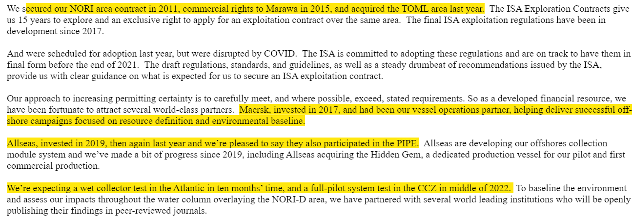 We believe that it is worth noting existing DeepGreen investors have committed to roll 100 percent of their equity and they anchored $50 million of the PIPE. These legacy investors, which include very successful natural resources investors and strategic partners alike, share our vision that The Metals Company can create substantial value, both for shareholders and society at large.