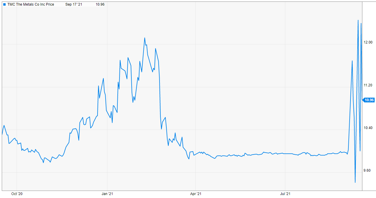 The company / SPAC is TMC, which deSPAC’d with SOAC (disclosure: I own some puts on them; though we’re talking in size so small that if this went to zero tomorrow I would be able to pick up a modest bar tab. Volatility is insane so I probably way overpaid for the puts, puts are super risky, and this is now a super thinly traded semi-meme stock that can truly trade at any level on any given day, so please remember to do your own work and that nothing on this blog is investing advice). The stock was formed when SOAC announced a deal to merge with DeepGreen Metals in early March, and shareholders approved the deal earlier this month.