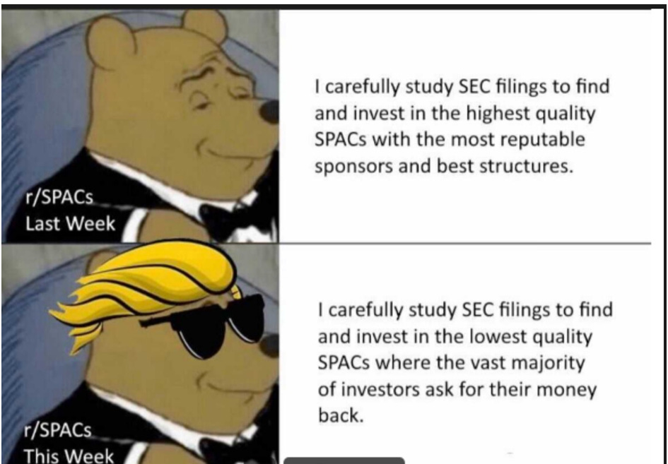 Honestly, all of that (the high redemptions and the mini-squeeze / large vol on a small float) are pretty typical for SPAC deals recently. I very much enjoyed this meme that perfectly sums up the state of the SPAC market currently: