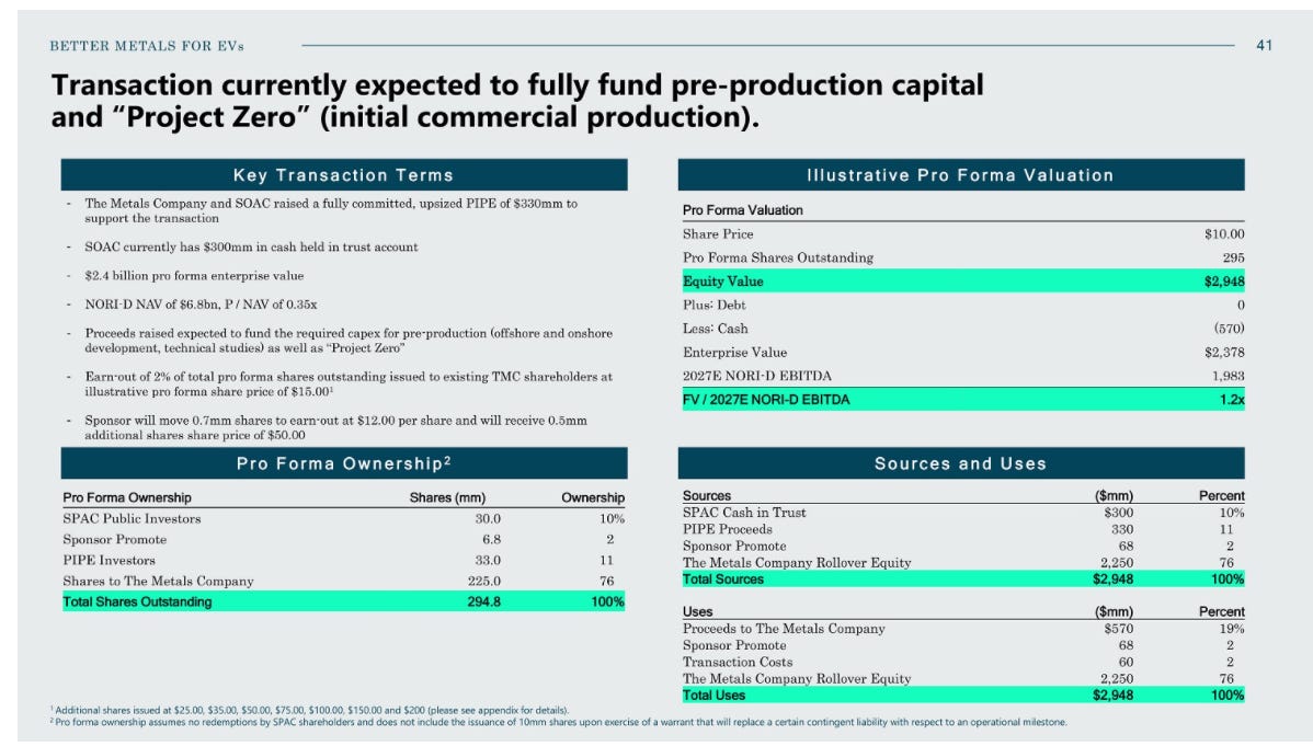Now, let me turn to our deal. Our transaction values the business post-combination at $2.4 billion on an enterprise value basis. A valuation that allows our shareholders and PIPE investors the chance to participate in enormous value creation potential with $300 million of cash in trust combined with $330 million of capital committed in an oversubscribed and upsized PIPE, we believe the business will meet the minimum cash condition to close our transaction and provide for the liquidity The Metals Company needs to reach initial production and positive cash flows from its first project, Project Zero.