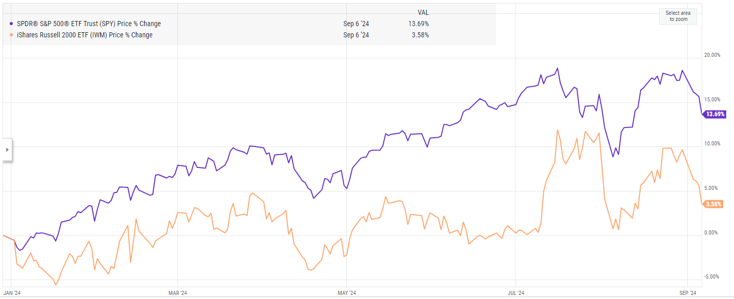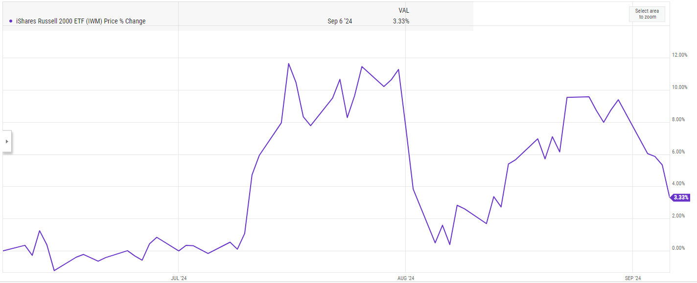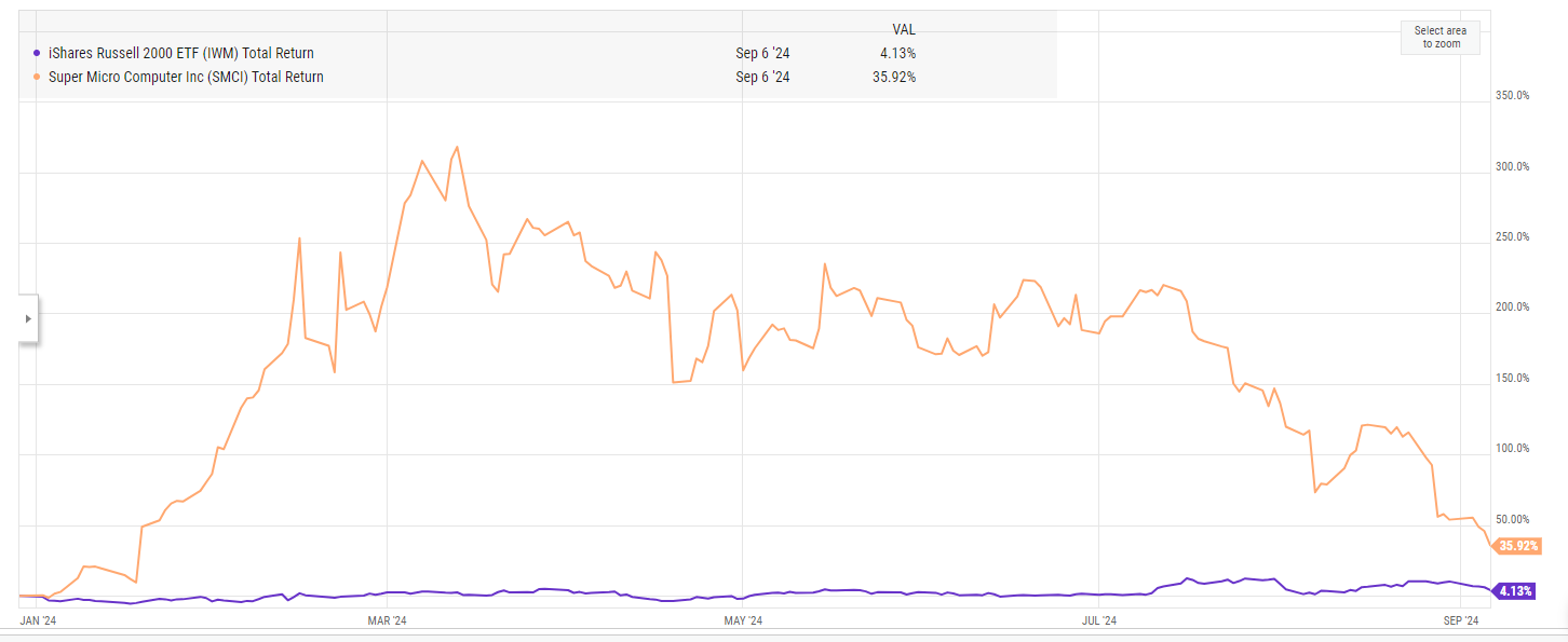And my understanding is that the Russell’s YTD returns are aided quite a bit by some seriously good trading of SMCI. SMCI was the heaviest component of the Russell when it left the index in late June; it had roughly tripled YTD at that time. Since then, the stock’s been ~cut in half (or worse). The solid trading of SMCI has apparently added 2-3% of returns to the IWM’s YTD performance (and, of course, SMCI is a pimple in the overall S&P 500, so its crash has had almost no effect on that index).