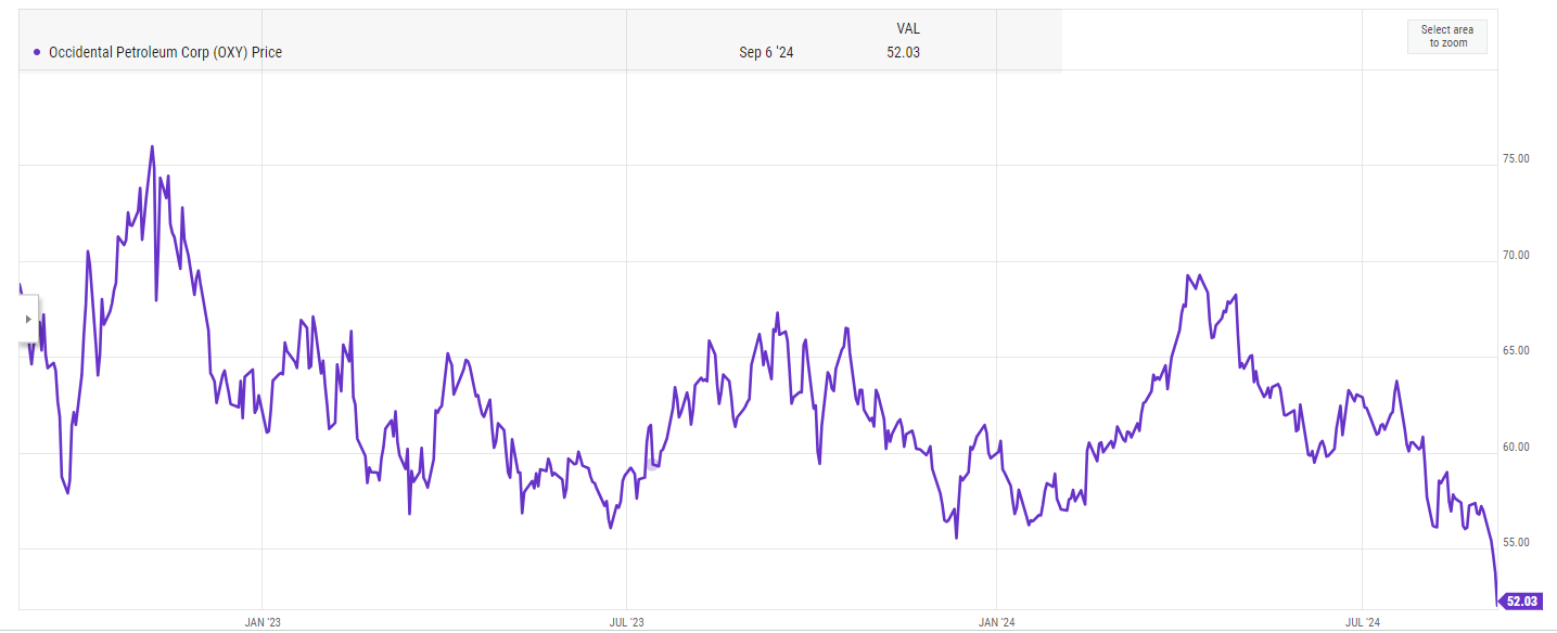 Today, OXY is trading in the low $50s, the lowest it’s been since early 2022 (i.e. before the Russian invasion of Ukraine and subsequent commodity spike).