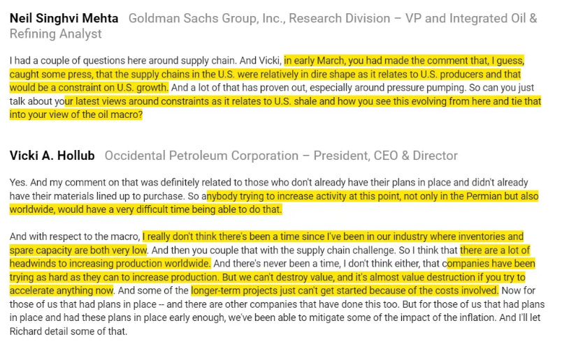 Here’s a quote from OXY that I thought nicely encapsulated why supply was going to be difficult to bring online in all timeframes (near, medium, and long term).