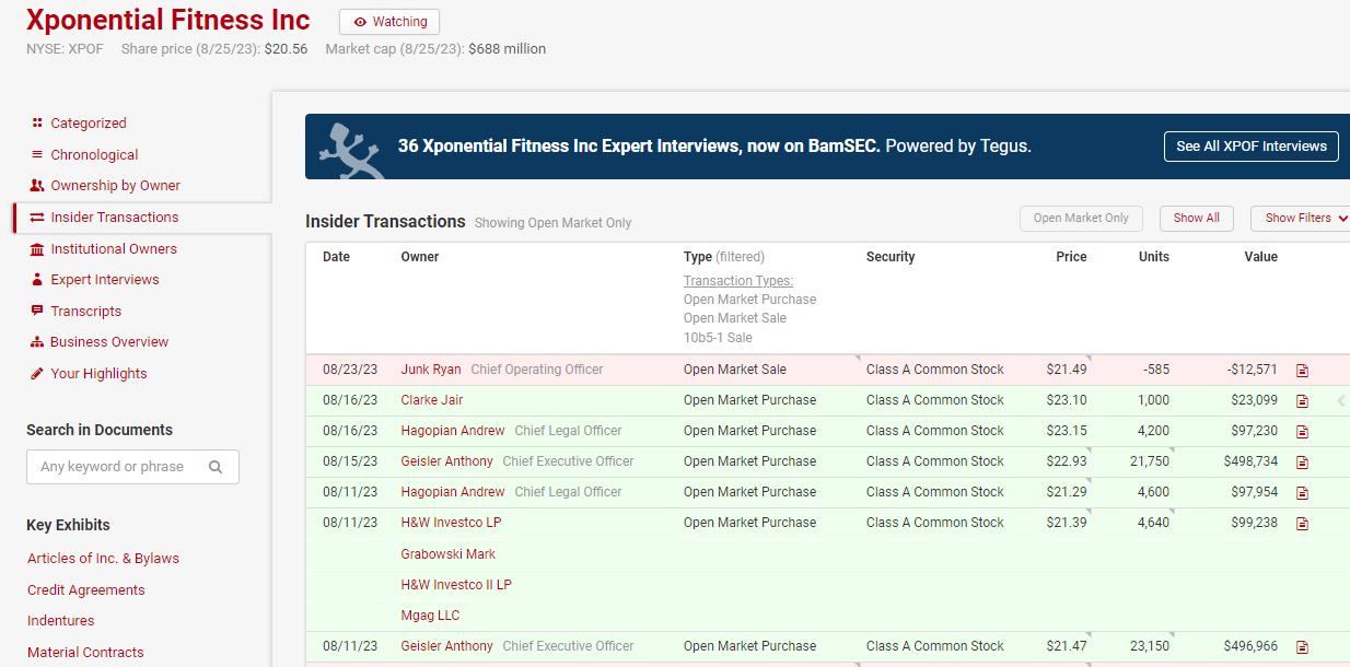 Since the follow up podcast came out, XPOF reported (strong) Q2 earnings and announced a $50m share buyback… but the real news has been insider buying. Insiders have stepped up and bought >$1m in stock since the earnings report, with the majority of that coming from the CEO.