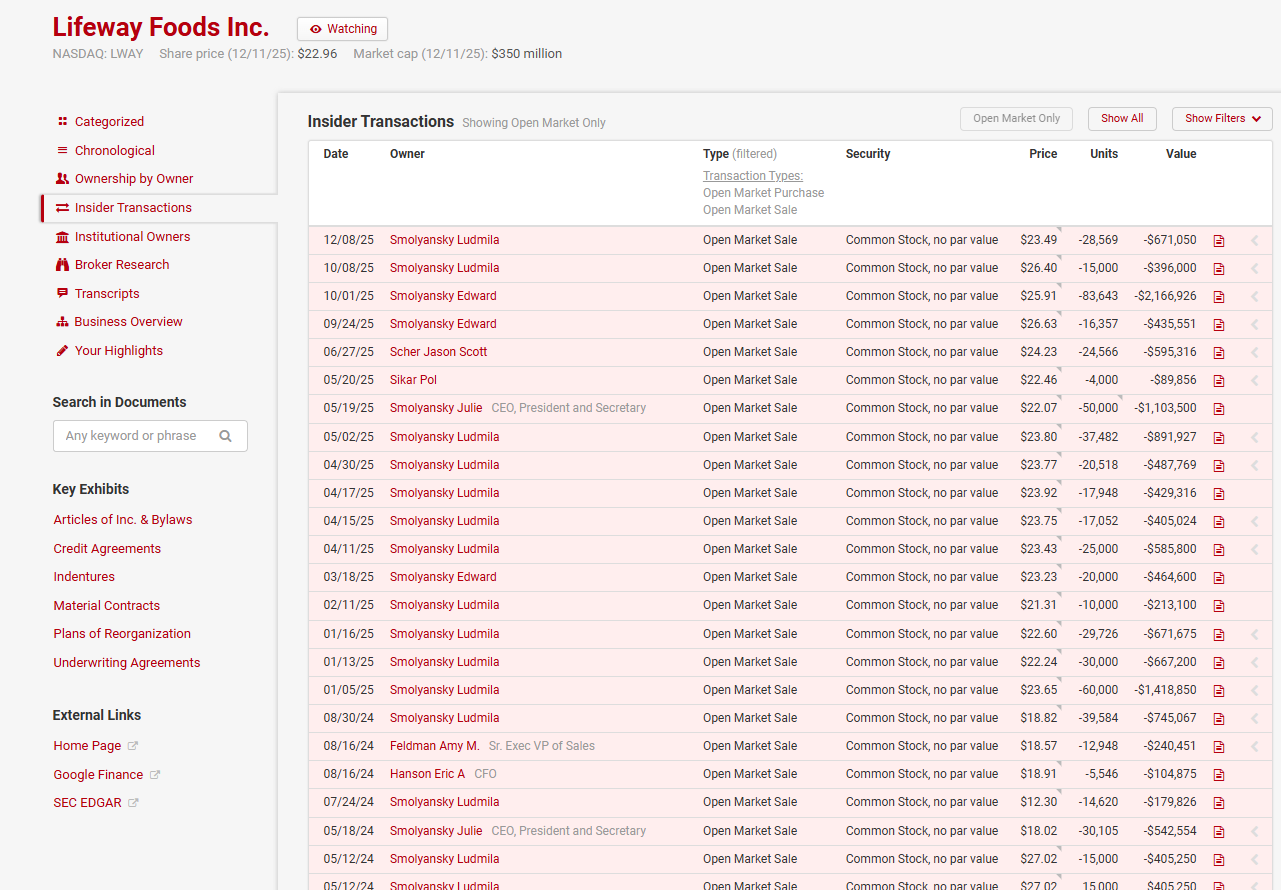 But there are no heroes on the other side. Edward and his mother have been pushing the company to sell itself for years…. is that because they believe a sale is the best course of action for Lifeway, or is it because they’re cash strapped? Lifeway claims that both of them are facing mortgage defaults and tax liens, and Ludmila in particular has been a consistent and aggressive seller of Lifeway stock over the past few years (all while waging an activist campaign centered on Lifeway being undermanaged and undervalued). It seems pretty clear they’ve been putting their own (liquidity) needs over what’s best for the business.