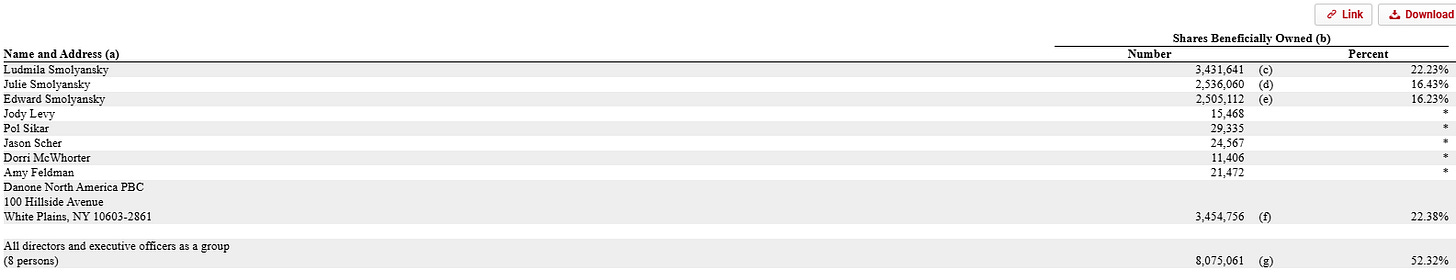 If you rewound the clock to late 2021 (before all the drama we’ll talk about started), the Smolyansky family controls >50% of Lifeway’s stock. Danone controls another >20%.
