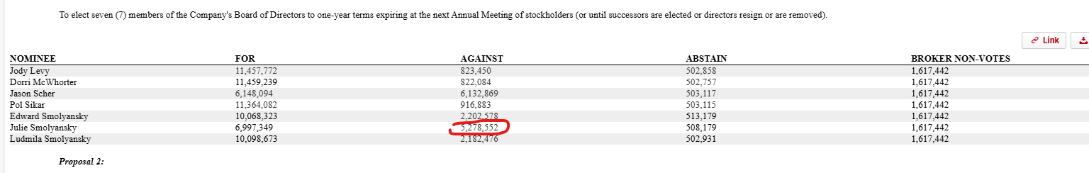 Things heat up a little more a week later, when the company’s annual meeting results come out and the CEO receives ~3m more “against” votes than her brother and mother. Incredibly, the difference in “against” votes between the two groups basically works out to what would happen if the brother and mother voted against the daughter while she, in turn, voted against her brother and mother.1