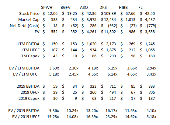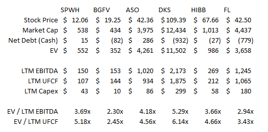 For example, I’ve spent a lot of time talking about Hibbett. I like their management team and hyper aggressive repurchase plan quite a bit, but I’m not even sure it’s fair to lump them in with ASO / DKS / BGFV / SPWH. HIBB is mainly apparel / fashion, so it might be closer to FL than the other players.