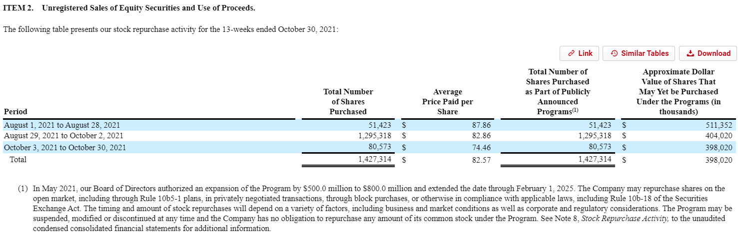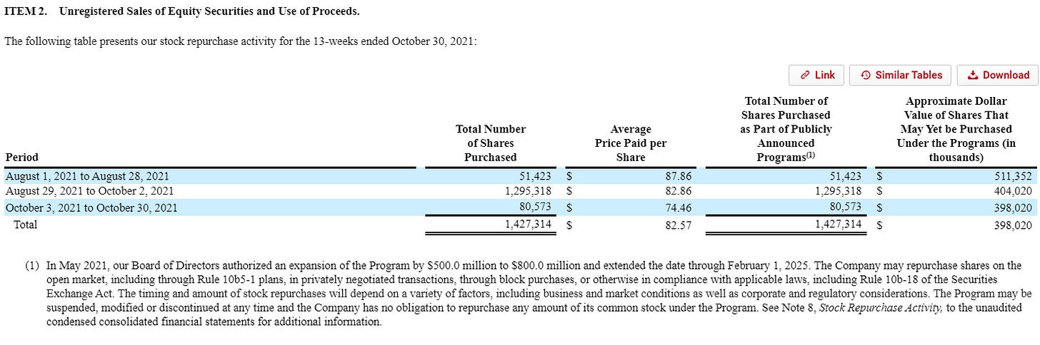 DKS Q3’21 call “Returning capital to shareholders will also continue to be an important component of our capital allocation strategy.”