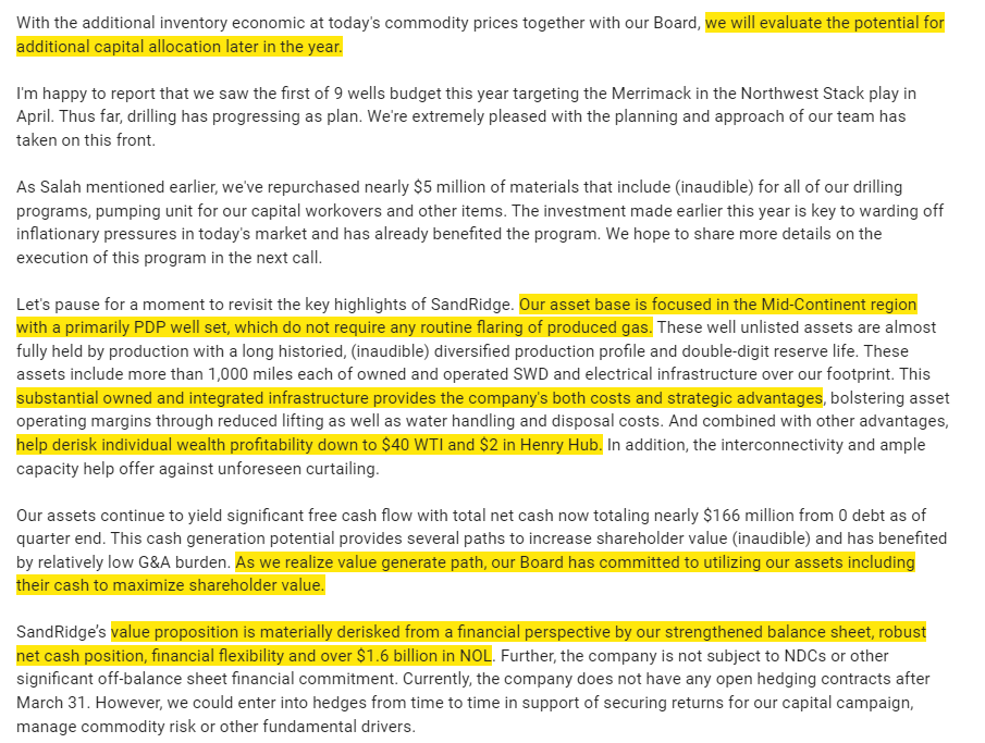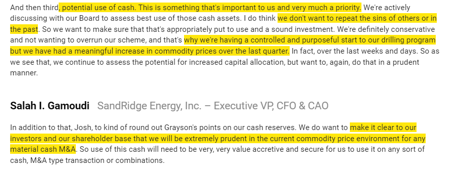 If the market is worried about #1 (management teams pursuing awful capital allocation)…. that’s what activist funds were made for. Buy a ton of the company, put someone on the board, and ensure that the huge cash flows the energy companies are generating get returned to shareholders and not spent on speculative projects or overpriced M&A. Note that I chose SD for one of my examples; that was not a random coincidence. Carl Icahn is the largest shareholder and I think they’ve been pretty clear they’ll follow a path similar to what I’m discussing here (quote below from their Q1’22 earnings call).