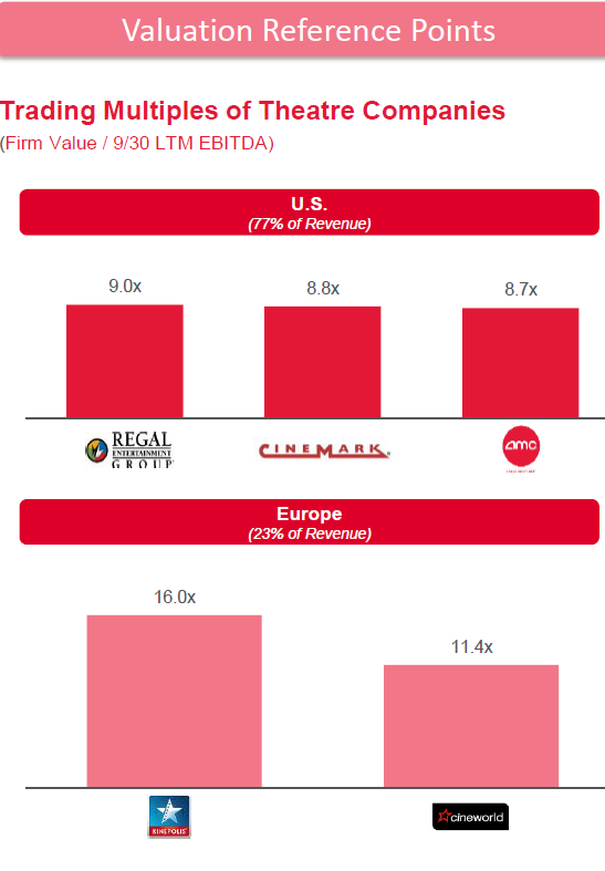 Euro multiples: ~25% of AMC’s value comes from its European theaters (its current EV is ~$7.7B, and they spent about $2.1B on Odeon and Nordic). European theaters trade for higher multiples for a combination of reasons (lower tax rate, more diverse revenue streams given local movies + American movies, lower penetration allows for higher growth, lower interest rates, etc). Given a quarter of AMC’s value comes from a group that probably deserves a higher multiple, the implied EV multiple for AMC’s U.S. theaters is well below peers. The slide below is a bit stale (I pulled it from an AMC investor deck), but it does a good job of highlighting this.