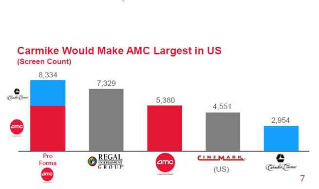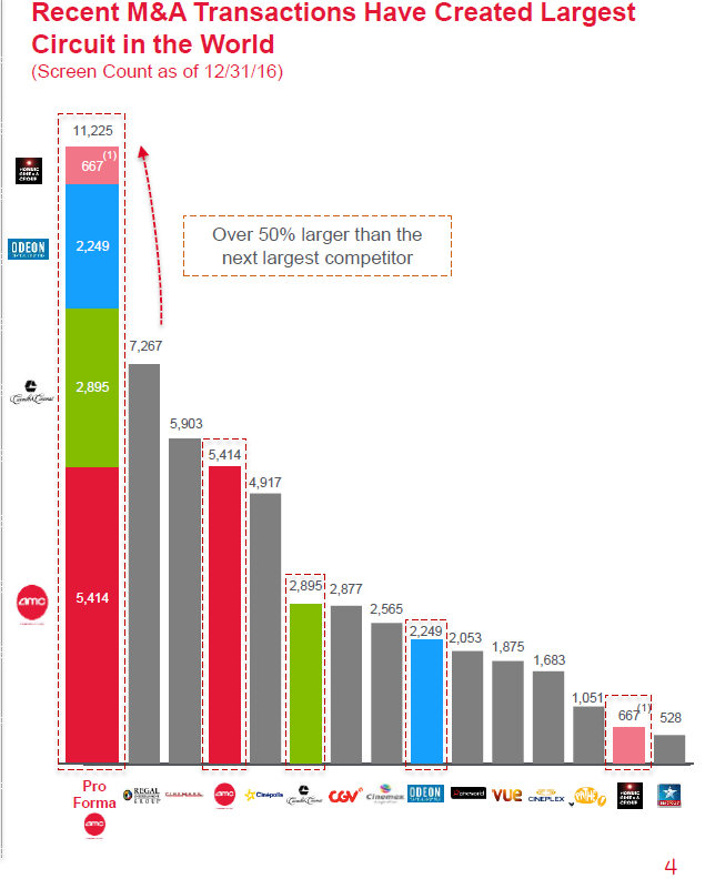 AMC is the largest movie theater exhibitor in the world. Their merger with Carmike in late 2016 made them the largest operator in the U.S., while their Odeon and Nordic mergers in late 2016 / early 2017 left them as the #1 player in Europe as well.