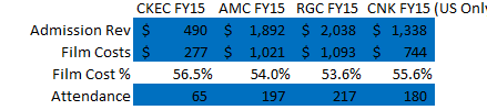 Earnings tailwind: AMC is now the largest player in both the U.S. and the world. There are some scale benefits to being the largest player in a given market. The largest scale benefit is your ability to negotiate film costs with the major studios. As a general rule of thumbs, box office admissions are split roughly evenly between the studio and the movie theater, but generally larger theaters can negotiate a slightly better box office split than their smaller peers. For example, in FY15, Carmike paid studios 56.5% of admissions revenue, while legacy AMC paid studios just 54%. The table below shows AMC, Regal, Carmike, and Cinemark’s Film Costs, Admissions revenue, and attendance for fiscal year 2015. As you can see, more attendance and larger admissions generally resulted in better film cost %.