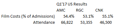 AMC is now the largest US player in admission by far, with Q1’17 attendance ~25% higher than RGC and 44% higher than CNK. Despite this, AMC’s film cost as a % of admissions revenue in Q1 was closer to CNK than it was to RGC. As AMC fully integrates CKEC and renegotiates its film studio contracts, I’d expect film costs to come down over time, resulting in an earnings tailwind over time. Given that earnings tailwind (and assuming all), you’d think AMC should trade at a higher LTM multiple because they’ll have higher built in earnings growth. Despite this, AMC trades in line with peers currently.