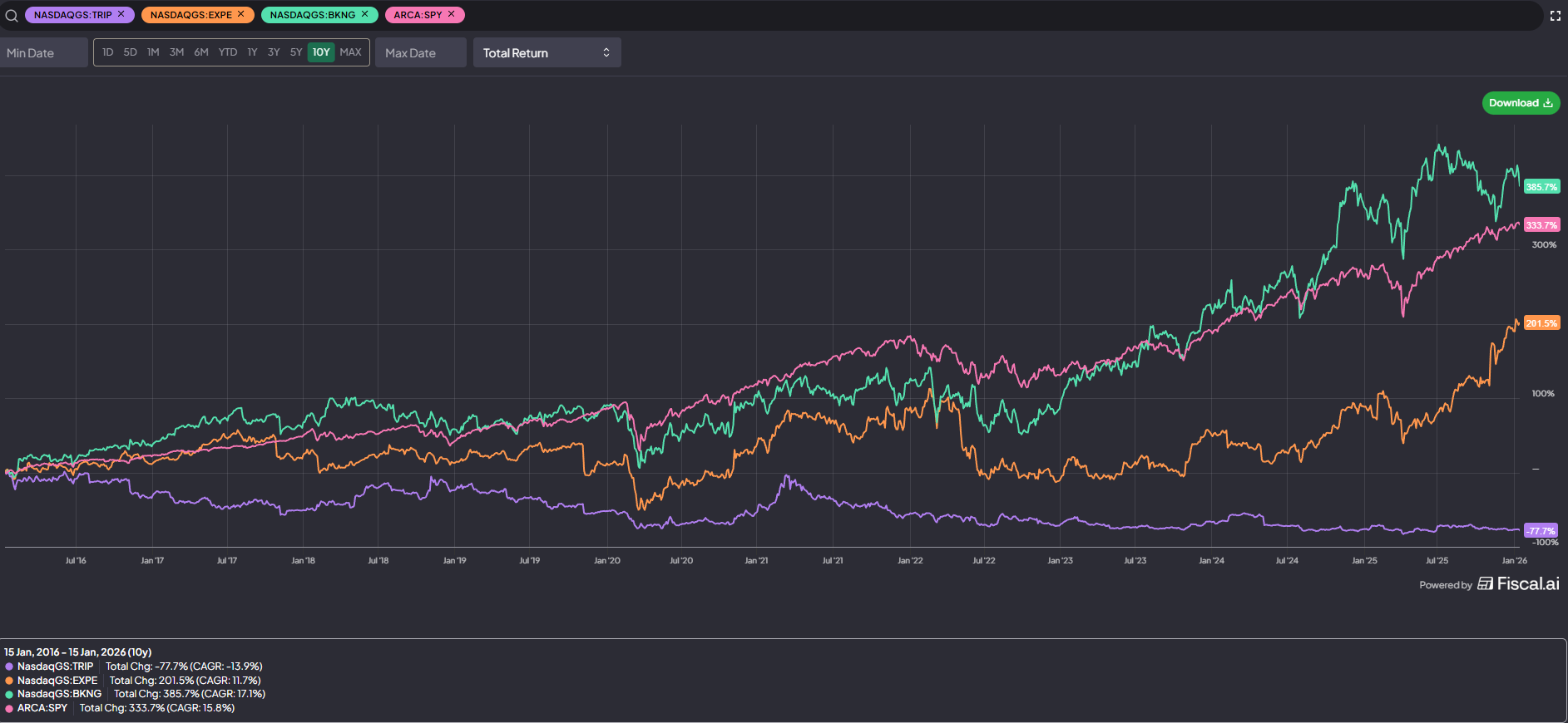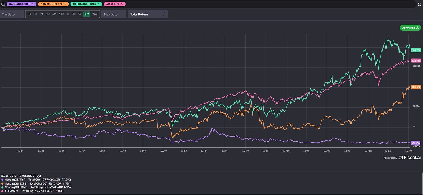 Of course, if you did talk yourself into any of these theses over the past decade, you generally had your face ripped off. Over the past ~10 years, TRIP’s stock is down ~80%, which lags both the indices and their loose peers (EXPE and BKNG) so much that’s honestly hard to visualize, though I will make an attempt: