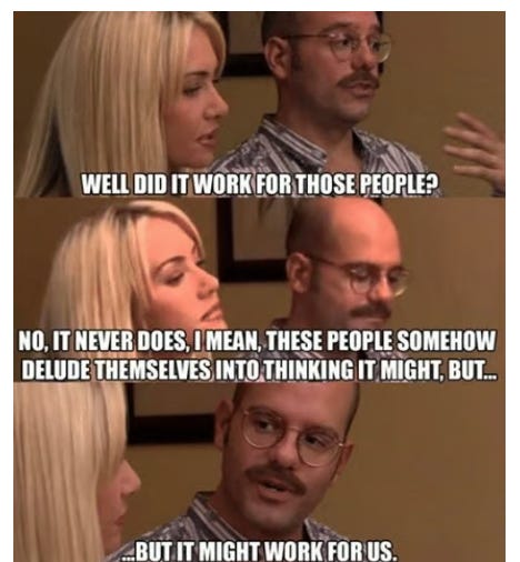 So, with all of that background in mind, I’ve found myself thinking about TRIP quite a bit recently (in part because I’ve had a few friends pinging me about it, including this nice write up / background from my friend Alex Morris). The basic thesis can be summed up pretty simply: over the past ten years, you’ve gotten your face ripped off investing in TRIP at any time on any thesis….. but this time things are different. That’s right; the thesis is basically the most dangerous words in finance1 / this meme: