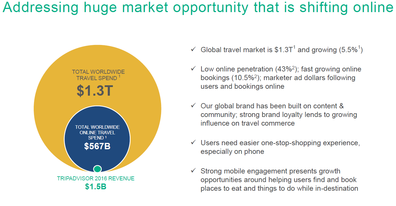 Growth investors have been attracted to TRIP because it attacked a huge market (worldwide travel spend) that had a growth tailwind (offline to online dollar shift plus increasing global wealth driving more leisure spending) plus TRIP’s “share” of travel spend was clearly much, much lower than the value of their reviews (i.e. their reviews moved huge amounts of travel dollars (TRIP estimated more than half of travelers used their reviews for hotels, which made TRIP the most popular way to decide on hotels), but TRIP captured only a fraction of them…. if they could just capture a tiny fraction more of the spend they influenced, the upside was enormous). TRIP made multiple attempts to increase their share of spend (including instant book and Tripadvisor Plus); all of them failed, but all of them generally got investors pretty excited for a hot second as they had dreams of massive growth.