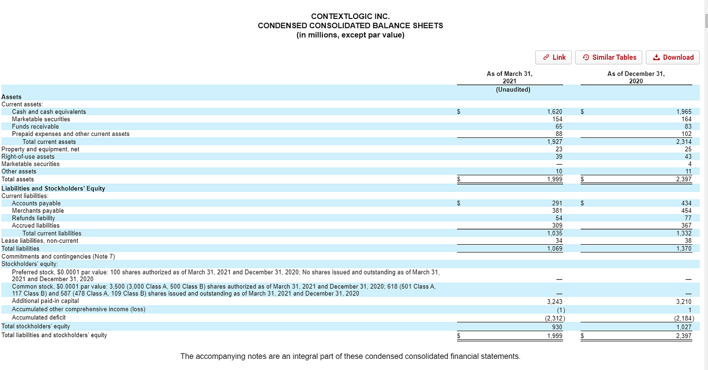 WISH’s IPO is important because the company raised ~$1.1B in it. That cash is currently mainly sitting on their balance sheet; cash + marketable securities comes out to ~$1.8B at the end of Q1’21, or just shy of $3/share.