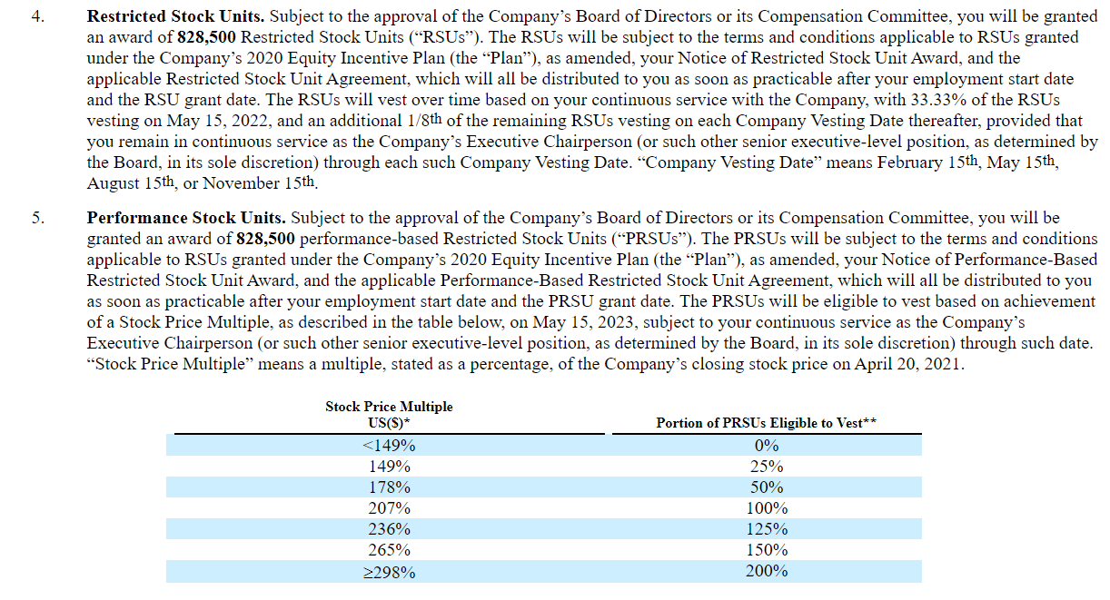 The bull case centers around Wish’s new executive chair. She has an impressive background, but what’s really interesting is her pay package. I’ve pasted a screenshot of the most important below, but it’s very RSU and PSU heavy. In order to 100% vest those PSUs, the stock price would need to go up >2x from the company’s stock price on April 20, 2021 by May 15, 2023. On April 20, the stock closed at ~$12/share, so the stock needs to touch ~$25 for her to fully vest those PSU’s (it would need to hit ~$36 to max vest). There is never any guarantee that a stock hits the internal targets, but if my friend nongaap has taught me anything it’s that companies don’t give out big share awards to a new exec with a buzzy background without both parties believing there’s a very realistic chance that they hit some of the bear targets.