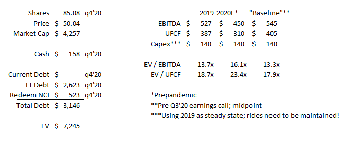 Valuing SIX is a little difficult because it's tough to know what earnings number to use. Obviously you don't want to use 2020 numbers since their parks were basically shut down. But should you use the pre-pandemic 2020 EBITDA projection? The 2019 EBITDA number? Or the baseline EBITDA number they're trying to hit in the future?