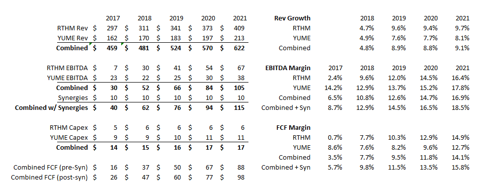 I’ll admit the math is rough. I haven’t deducted stock comp from their adjusted EBITDA (a very real expense) or taken taxes out of the FCF projection. I’m sure there will be integration expenses, and this is a rapidly changing industry where historical forecasts can be dated at a moment’s notice. Still, the combined company is forecasting high single digit revenue growth and is trading for under 4x EBTIDA / 5x FCF. That is a very strange combination that will not last long. Either RTHM will deliver that growth and shares will rocket higher, or RTHM will not and….. well, it’s not clear what would happen to RTHM then given how low the price /multiple is today.