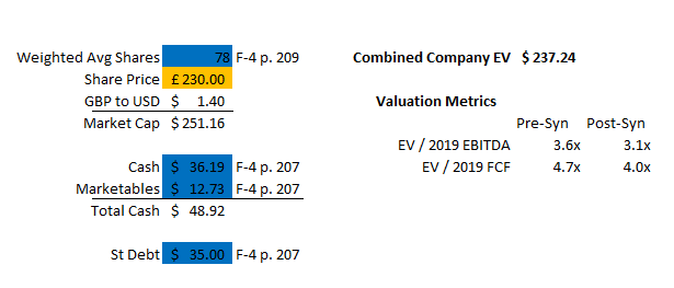 Pretty interesting! That looks even better than the numbers I had backed into in the first post- I had been originally guessing PF EBITDA margins of ~10% with ~4% of sales going to capex, and their projections would have them closing in on 20% margins (after synergies) with less than 3% of sales going to capex. Obviously, these are just projections and things can change rapidly, but if the company comes anywhere close to those numbers shares are going to look insanely cheap in hindsight. The table below uses disclosures from the company’s F-4 to come up with a PF balance sheet (given the majority of earnings are in the back half of the year, I would guess net cash is actually higher today); using 2019 numbers (assuming that’s when they get things fully integrated and ramping up), RTHM is trading for below 4x EBITDA and under 5x pre-tax cash flow.
