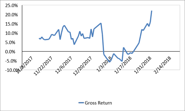 Ok, fundamental update out of the way, I want to flip gears a little bit and talk about the trading dynamics in YUME. I mentioned earlier that YUME shareholders got proceeds of somewhere between $4.14/share to $4.40/share for their YUME shares when the merger closed. That’s pretty wild given YUME traded for ~$3.70/share for the entire last week it was trading, so the stock market was offering ~10% gross return leading right up to deal close. In fact, YUME traded for a pretty crazy spread for months leading up to the deal close despite no signs or rumors that the deal would fail to close. The chart below shows gross spread for YUME for the ~3 months leading up to deal close.